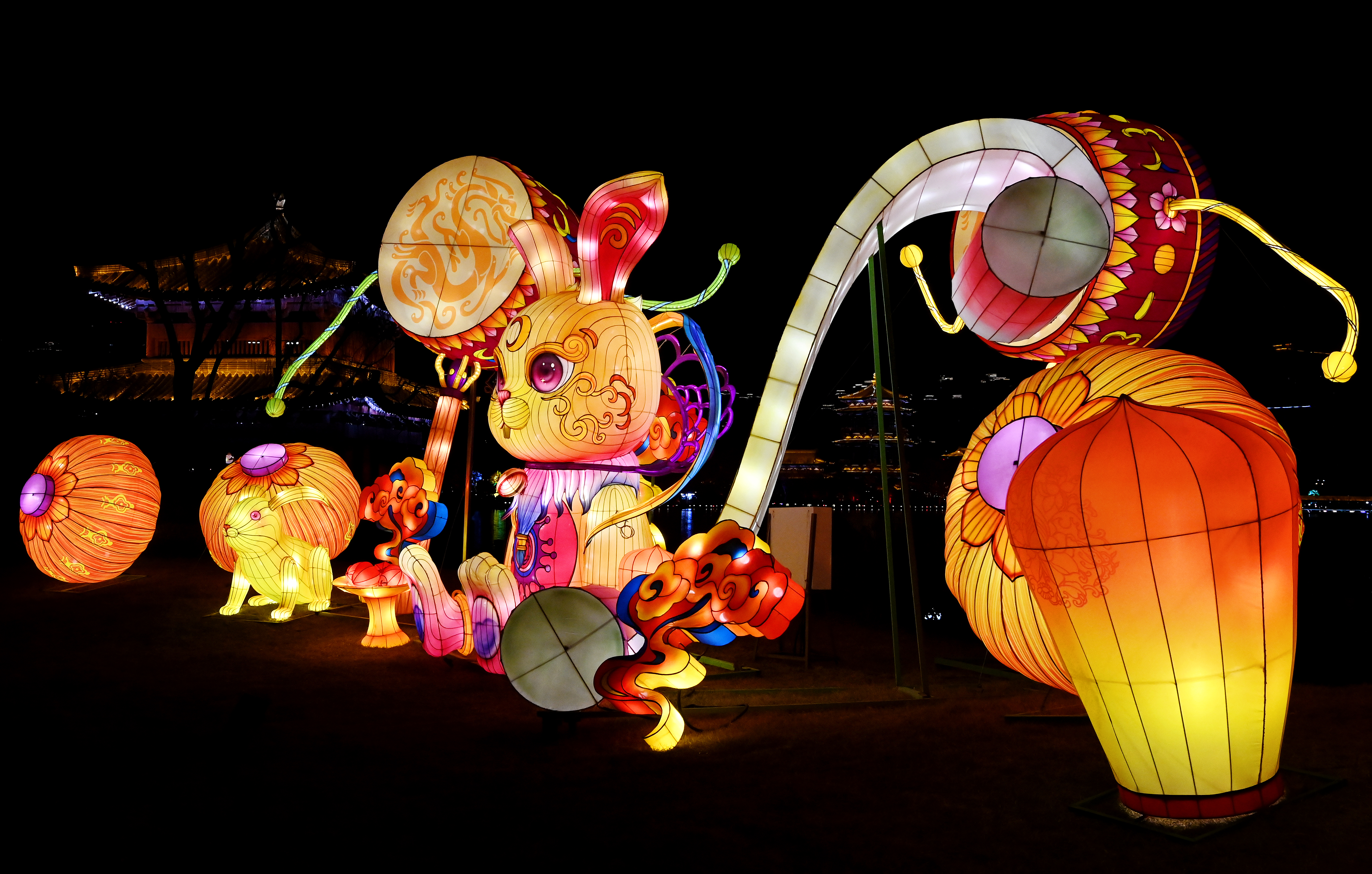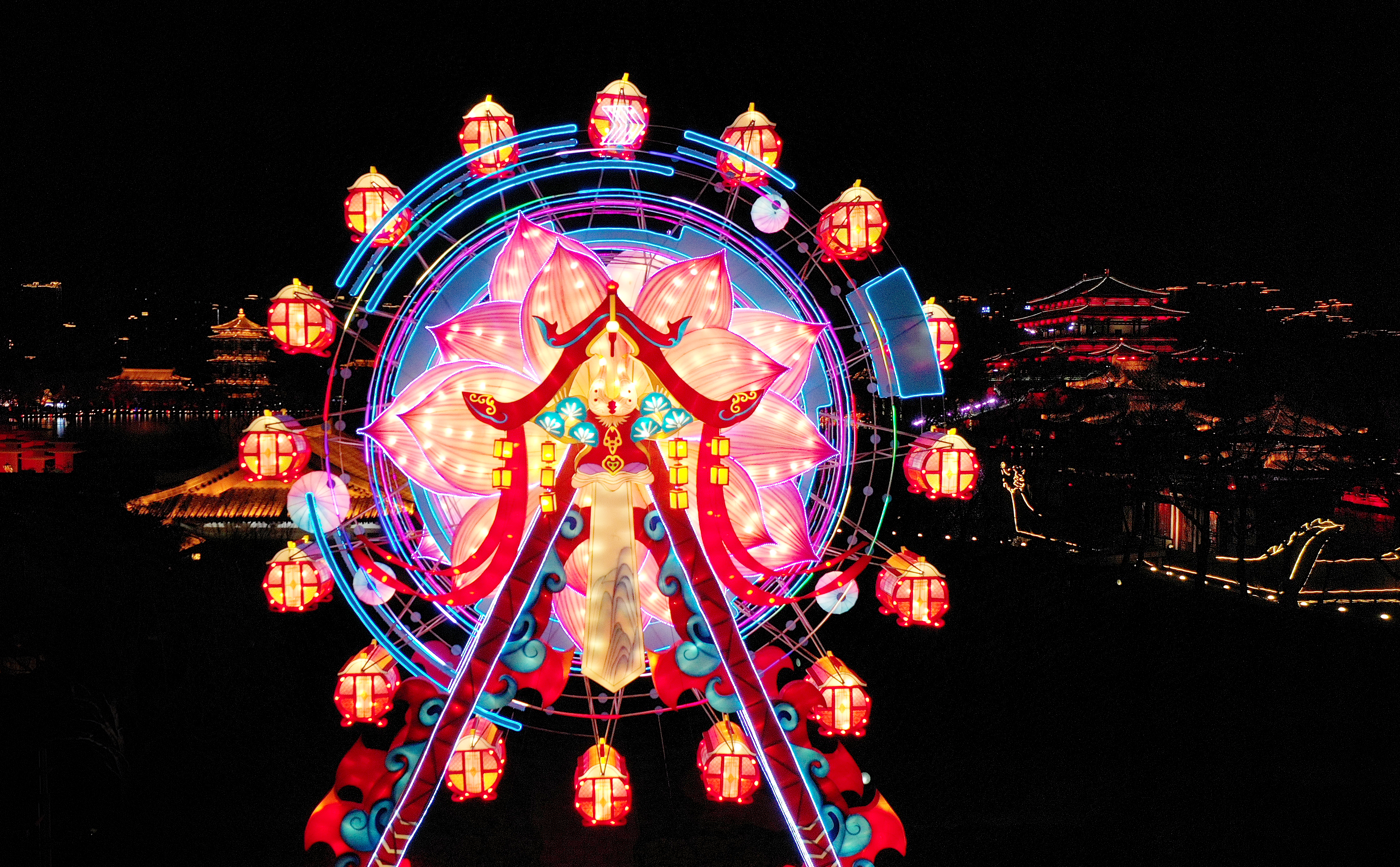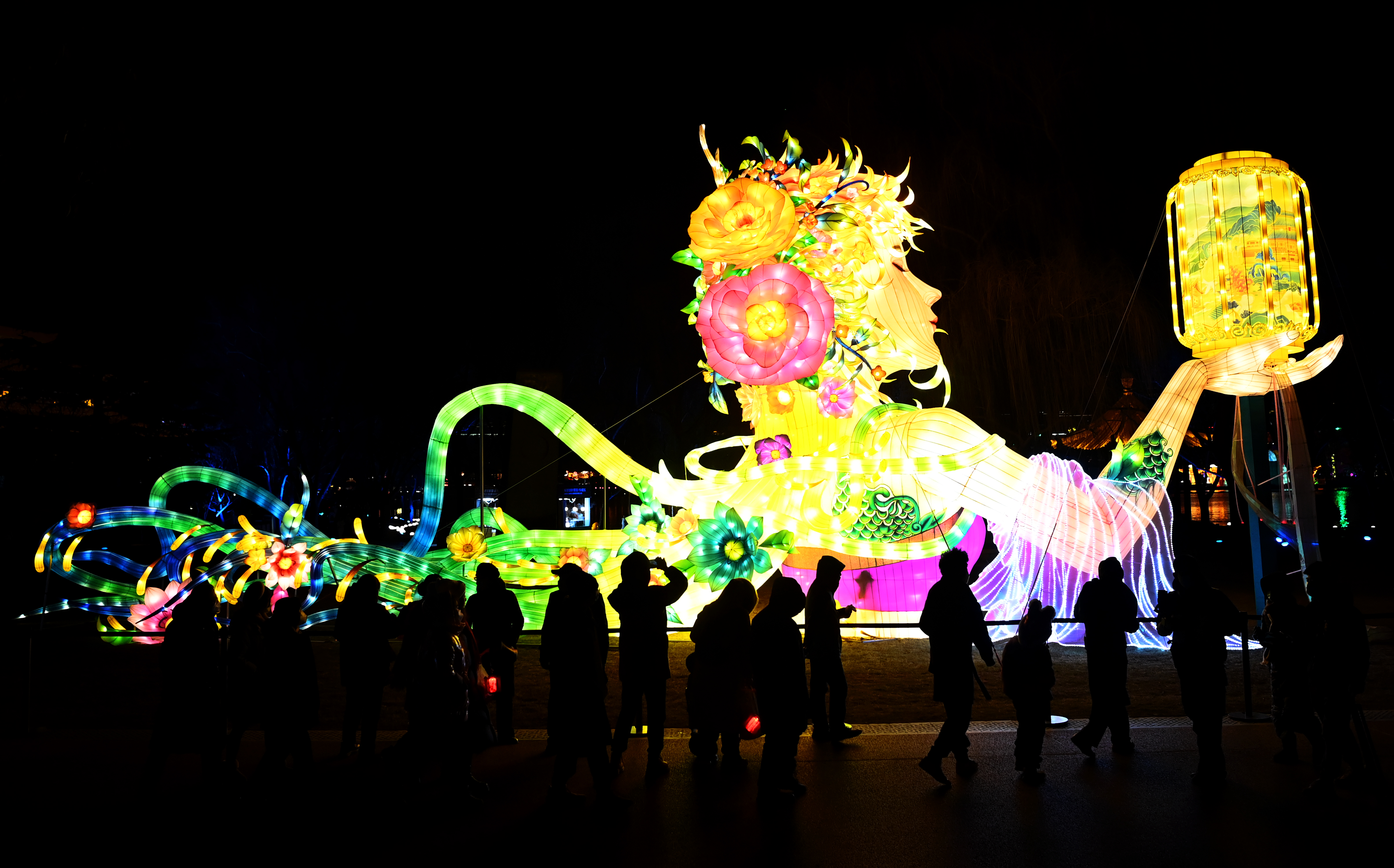 夜幕降臨,西安大唐芙蓉園內(nèi)萬(wàn)盞花燈璀璨綻放,在仿唐式園林的亭臺(tái)樓閣、廊橋水波之間,燈與景交相輝映,美輪美奐。