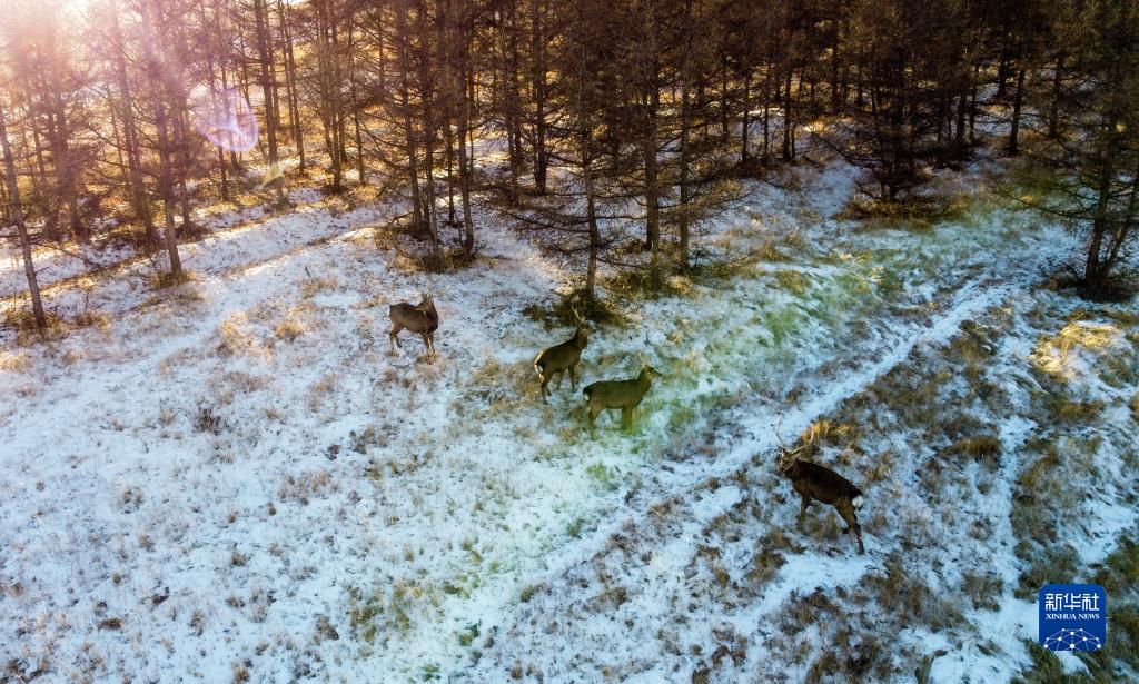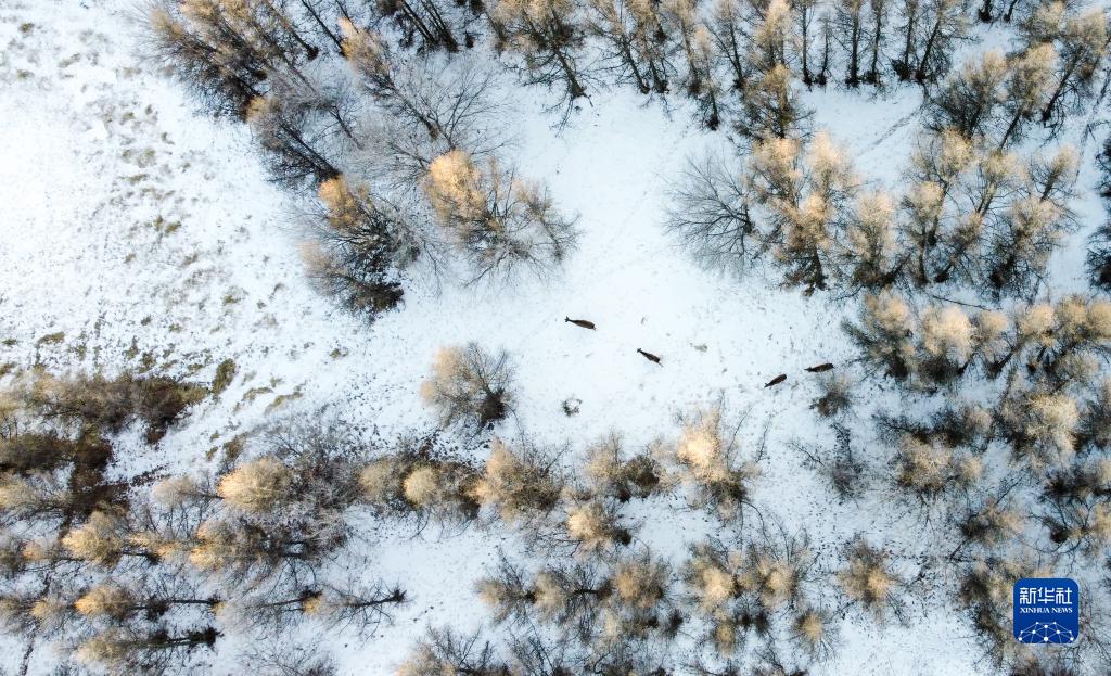 1月29日,一群馬鹿在灤河源國家森林公園內(nèi)覓食(無人機照片)。新華社記者 賀書琛 攝
