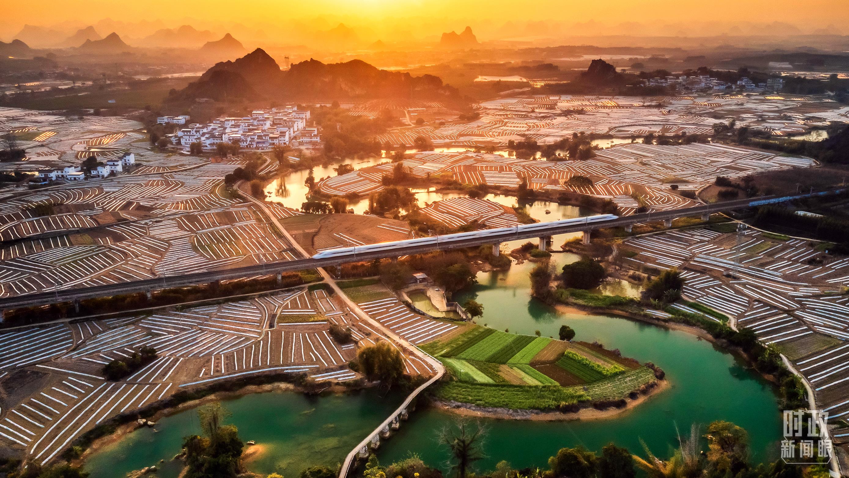 △2023年1月25日,農(nóng)歷春節(jié)期間,一輛高鐵列車駛過南寧隆安縣蔬果種植基地和新農(nóng)村。(圖/視覺中國)