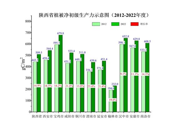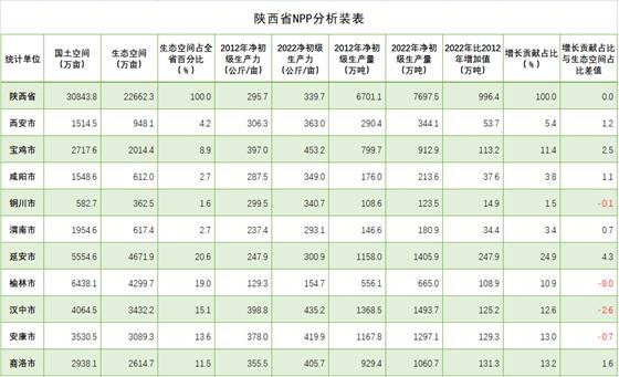 陜西省是中國版圖原點、腹心所在,堪稱中華家園中的內園、核心園,自然生態(tài)空間遭受經濟社會發(fā)展侵入的時間久、強度大。曾經最精美的生態(tài)空間已開辟為現(xiàn)在的城鎮(zhèn)、鄉(xiāng)村,有幸保留下來的生態(tài)空間也已歷經掏挖劫掠、生態(tài)系統(tǒng)功能遭受重創(chuàng)。進入新時代,在綠水青山就是金山銀山理念引導下,生態(tài)空間發(fā)生了廣泛而深刻的綠色革命,促進了生態(tài)生產力持續(xù)增長。陜西省生態(tài)空間數(shù)據(jù)中心演算結果顯示,2022年全省生態(tài)空間植被凈初級生產力水平為339.7公斤/畝,比2012年的295.7公斤/畝增加44公斤/畝,增長14.9%。全省生態(tài)空間植被凈初級生產量由2012年的6701.1萬噸增加到7697.5萬噸,增加996.4萬噸,增長14.9%。