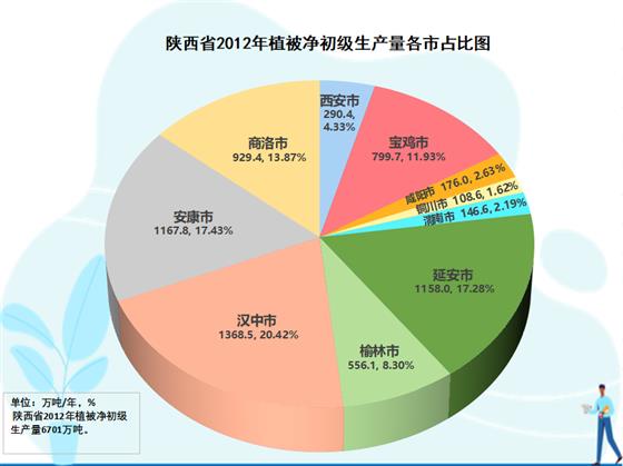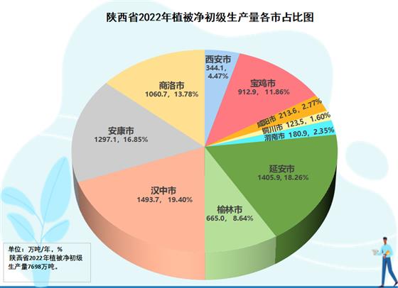 全省元生產力區(qū)域分析結果表明,在三大區(qū)域生態(tài)蛋糕越來越大的同時,生態(tài)蛋糕的空間布局上與結構發(fā)生變化,呈現(xiàn)黃河流域綠色崛起大趨勢。陜北榆林、延安兩市,生態(tài)空間8971.6萬畝,占全省的39.6%;關中西安、寶雞、咸陽、渭南、銅川五市生態(tài)空間4554.5萬畝,占全省的29.2%;陜南漢中、安康、商洛三市生態(tài)空間9136.2萬畝,占全省的40.2%。2022年,陜北兩市提供了2070.9萬噸植被凈初級生產量,占全省的26.9%,比2012年的1714.1萬噸增加313.8萬噸,增長18.3%,在全省份額上升了1.3個百分點;關中五市提供了1775.1萬噸的植被凈初級生產量,占全省的23.1%,比2012年的1524.3萬噸250.8萬噸,增長16.4%,在全省份額上升了0.3個百分點;陜南三市提供了3851.5萬噸植被凈初級生產量,占全省的50.0%,比2012年的3462.7萬噸增加388.8萬噸,增長11.2%,在全省份額下降了1.6個百分點。2012-2022年全省新增生態(tài)蛋糕996.4萬噸,陜北兩市貢獻31.5%,關中五市貢獻29.5%,陜南三市貢獻39.0%。陜北、關中提供的生態(tài)蛋糕占全省的份額已由2012年的48.4%提高到2022年的50.0%。