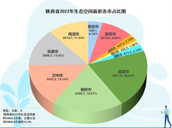 陜西南部秦巴山脈、北部黃土高原、中部渭河川地,自然生態(tài)空間多、占比大。陜西省生態(tài)空間數(shù)據(jù)中心提供的數(shù)據(jù)顯示,全省國土空間3.08億畝,其中生態(tài)空間(林地、草地、濕地、荒野)2.26億畝。從全省10市生態(tài)空間大格局分析觀察,黃土高原腹地的延安是全省生態(tài)空間第一市,生態(tài)空間4671.9萬畝、占本市國土空間84.1%、占全省生態(tài)空間20.6%。長城內外、林草過度的榆林居第二,生態(tài)空間4299.7萬畝、占本市國土空間66.8%、占全省生態(tài)空間19.0%。第三是漢中,生態(tài)空間3432.2萬畝、占本市國土空間84.4%、占全省生態(tài)空間15.1%。第四是安康,生態(tài)空間3089.3萬畝、占本市國土空間87.5%、占全省生態(tài)空間13.6%。其后,依次分別是商洛,生態(tài)空間2614.7萬畝、占本市國土空間90.0%、占全省生態(tài)空間11.5%,寶雞2014.4萬畝、占本市74.1%、占全省8.9%,西安948.1萬畝、占本市62.6%、占全省4.2%,渭南617.4萬畝、占本市31.5%、占全省2.7%,咸陽612萬畝、占本市39.5%、占全省2.7%,銅川362.5萬畝、占本市62.2%、占全省1.6%。