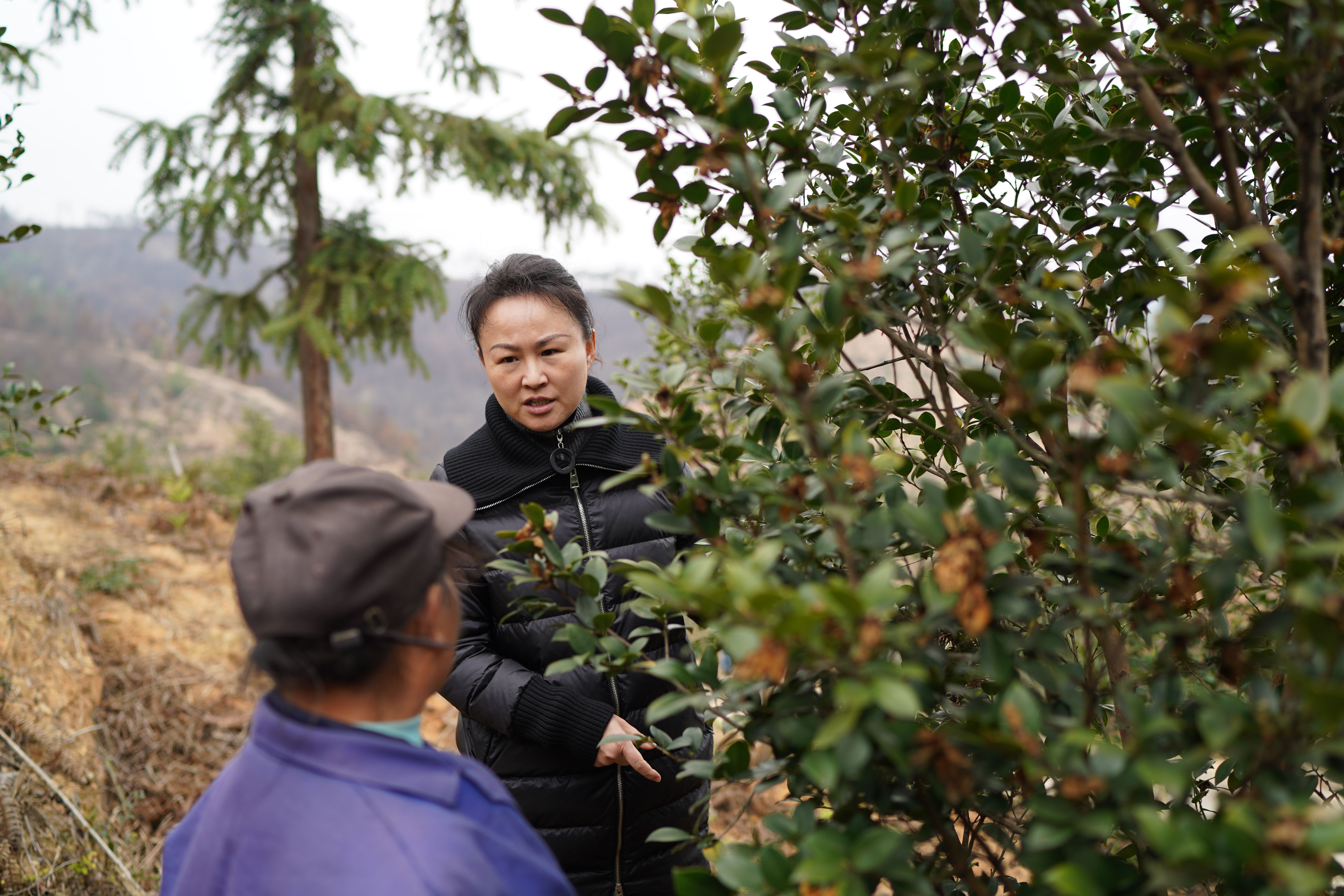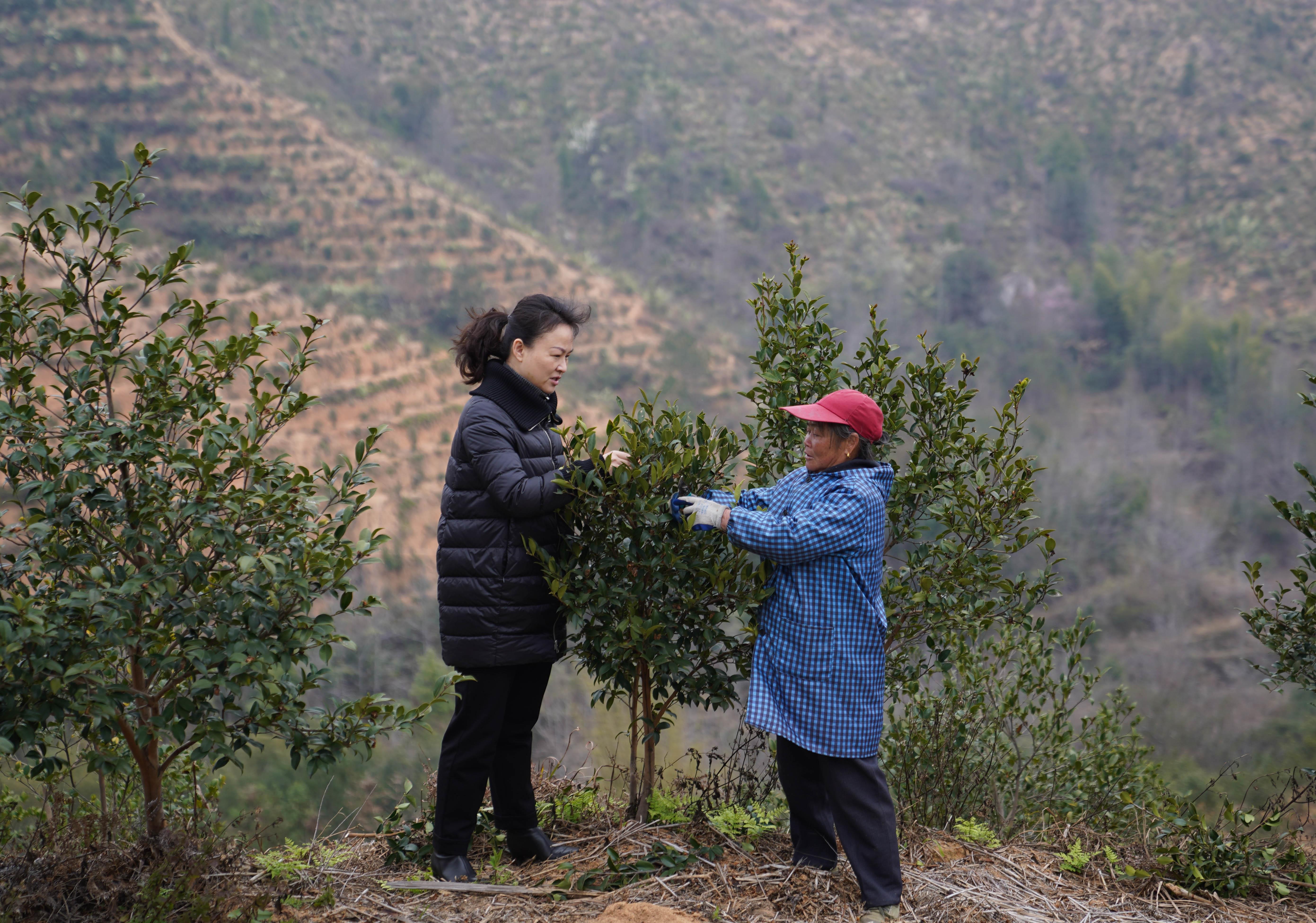 2月24日,明經(jīng)華(右)在江西贛州市經(jīng)開區(qū)湖邊鎮(zhèn)蛤湖村白石下油茶基地調(diào)研油茶產(chǎn)業(yè)。新華社記者 周密 攝