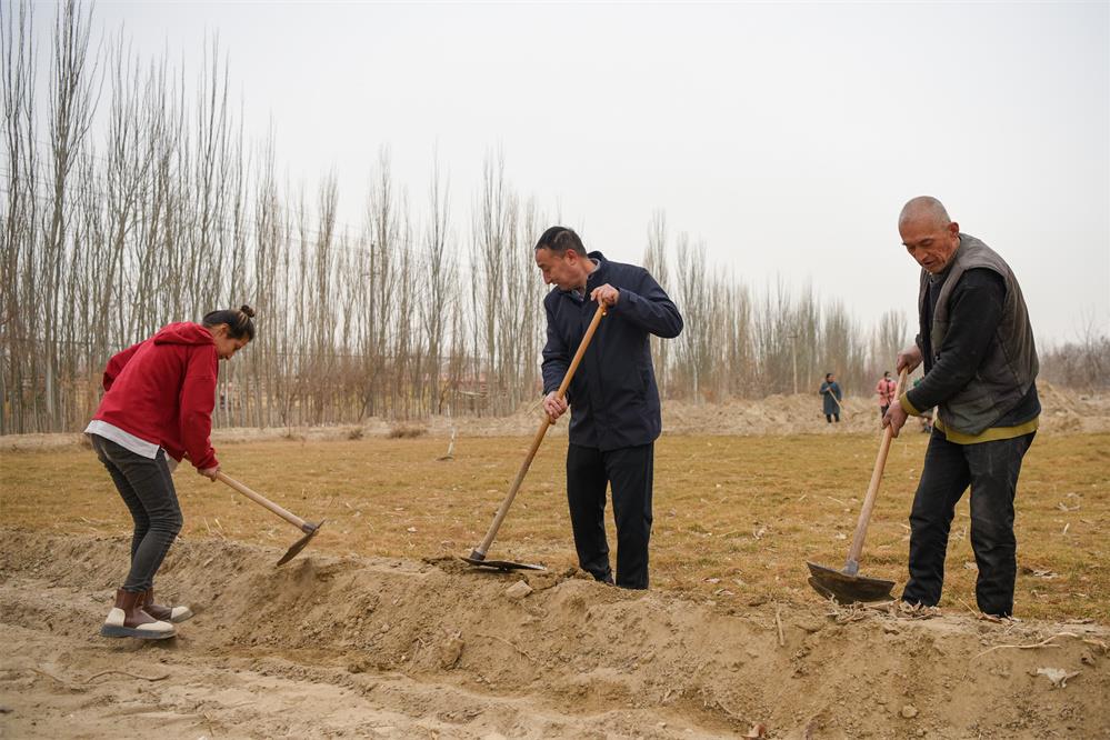 2月20日,在新疆和田地區(qū)策勒縣巴什玉吉買村,買買提依布熱依木·買買提明(中)和村民一起整理土地,為春耕生產(chǎn)做準(zhǔn)備。新華社記者 丁磊 攝