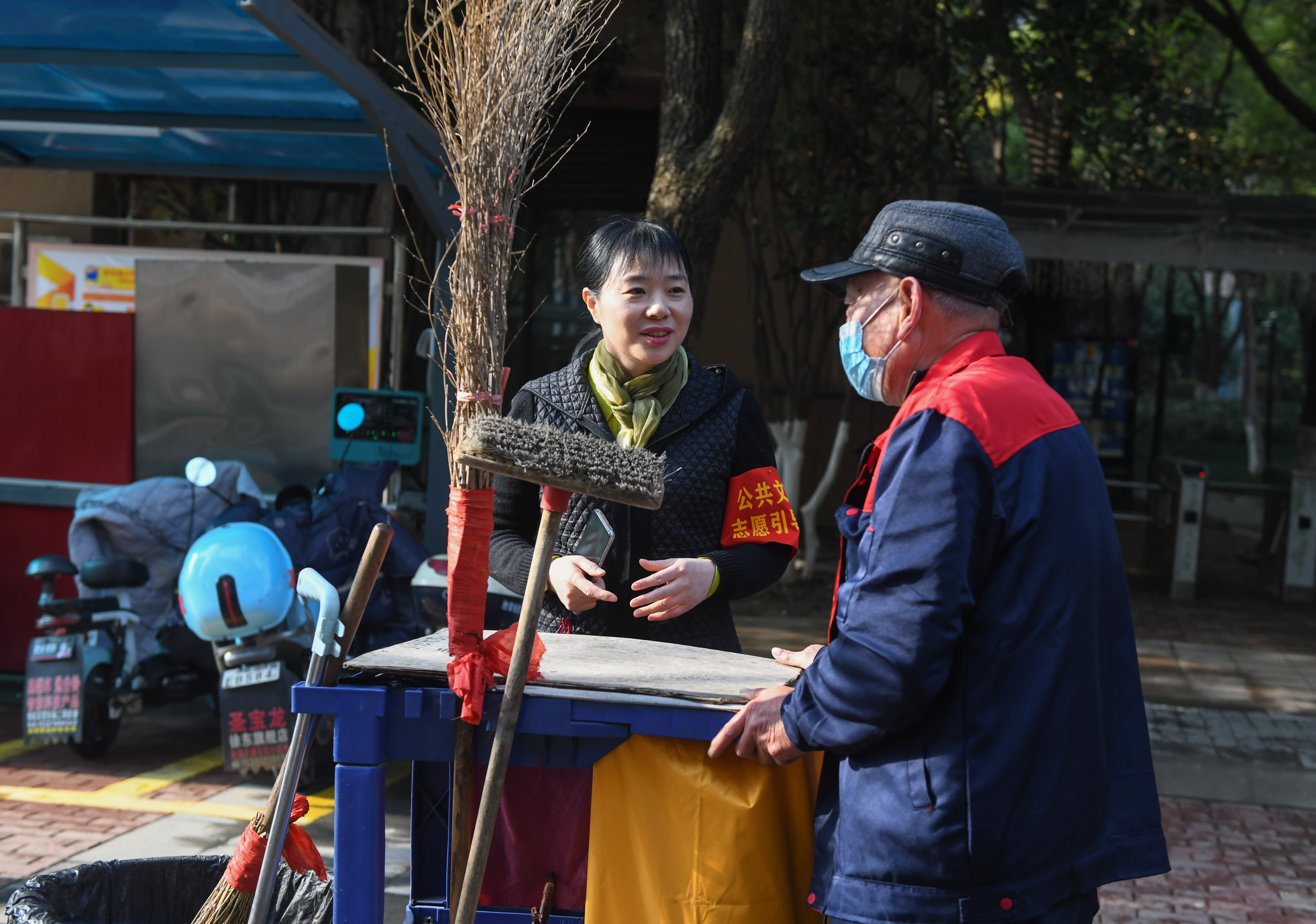 禹誠(左)在武漢市洪山區(qū)和平街愛家國際社區(qū)了解衛(wèi)生排班情況(2月19日攝)。新華社記者 程敏 攝