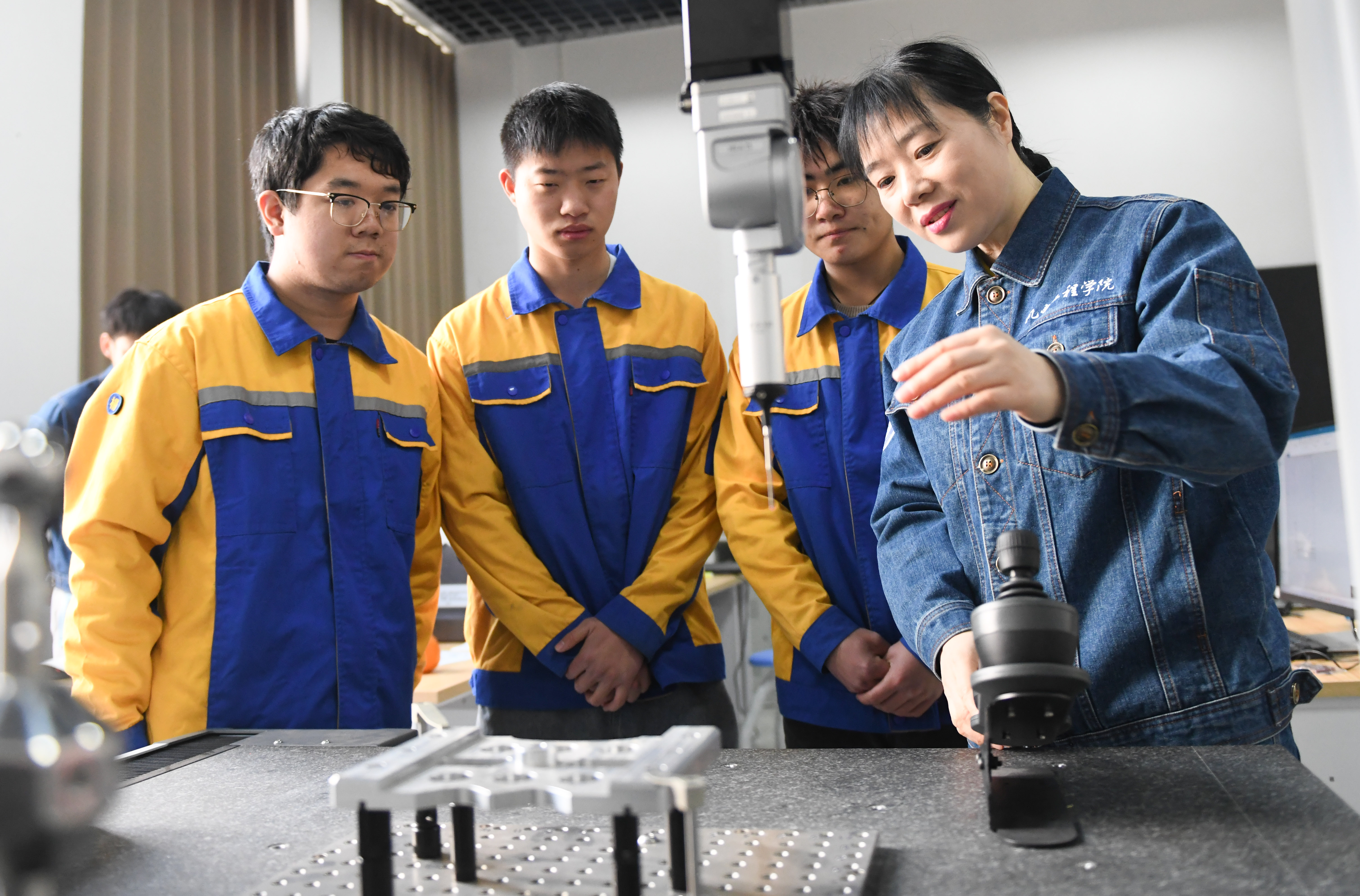 禹誠(右一)在學(xué)院指導(dǎo)學(xué)生操作機(jī)床(2月19日攝)。新華社記者 程敏 攝