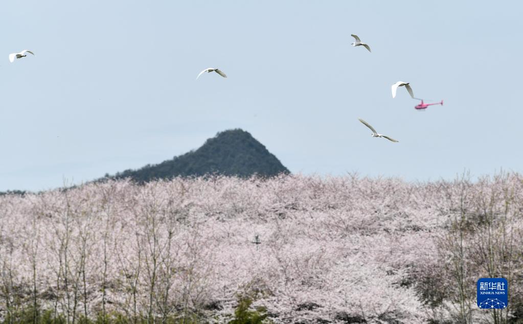 3月21日,一群鳥(niǎo)在貴州省貴安新區(qū)櫻花園內(nèi)飛翔。新華社記者 楊文斌 攝