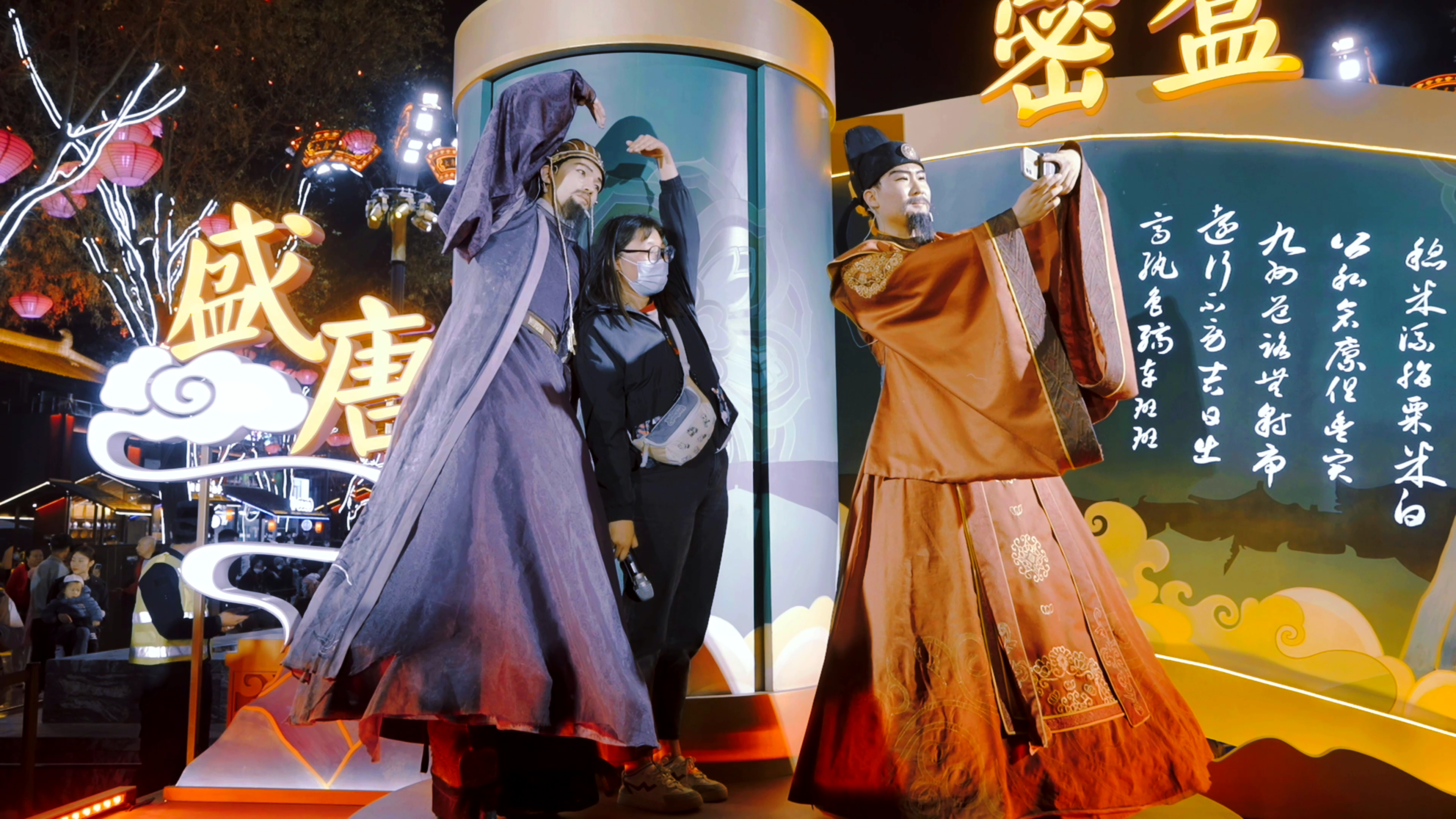 “《西游記》中九九八十一難,第一難是什么?”“不知道,不要緊,來,拍個(gè)照。”夜色漸濃,西安市大雁塔下的大唐不夜城華燈熠熠,流光溢彩。兩位身著古裝的演員,分別扮演唐代名人房玄齡和杜如晦,出題與游客進(jìn)行互動(dòng),幽默風(fēng)趣的提問和回答引得臺(tái)下觀眾不時(shí)發(fā)出陣陣歡笑。