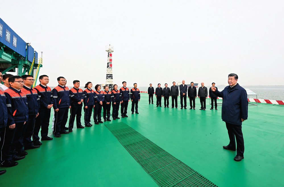 5 月 11 日至 12 日,中共中央總書記、國家主席、中央軍委主席習(xí)近平在河北考察,并主持召開深入推進(jìn)京津冀協(xié)同發(fā)展座談會(huì)。這是 11 日下午,習(xí)近平在滄州市黃驊港煤炭港區(qū)碼頭考察時(shí),同碼頭工作人員、船務(wù)人員親切交流 李學(xué)仁攝 / 本刊