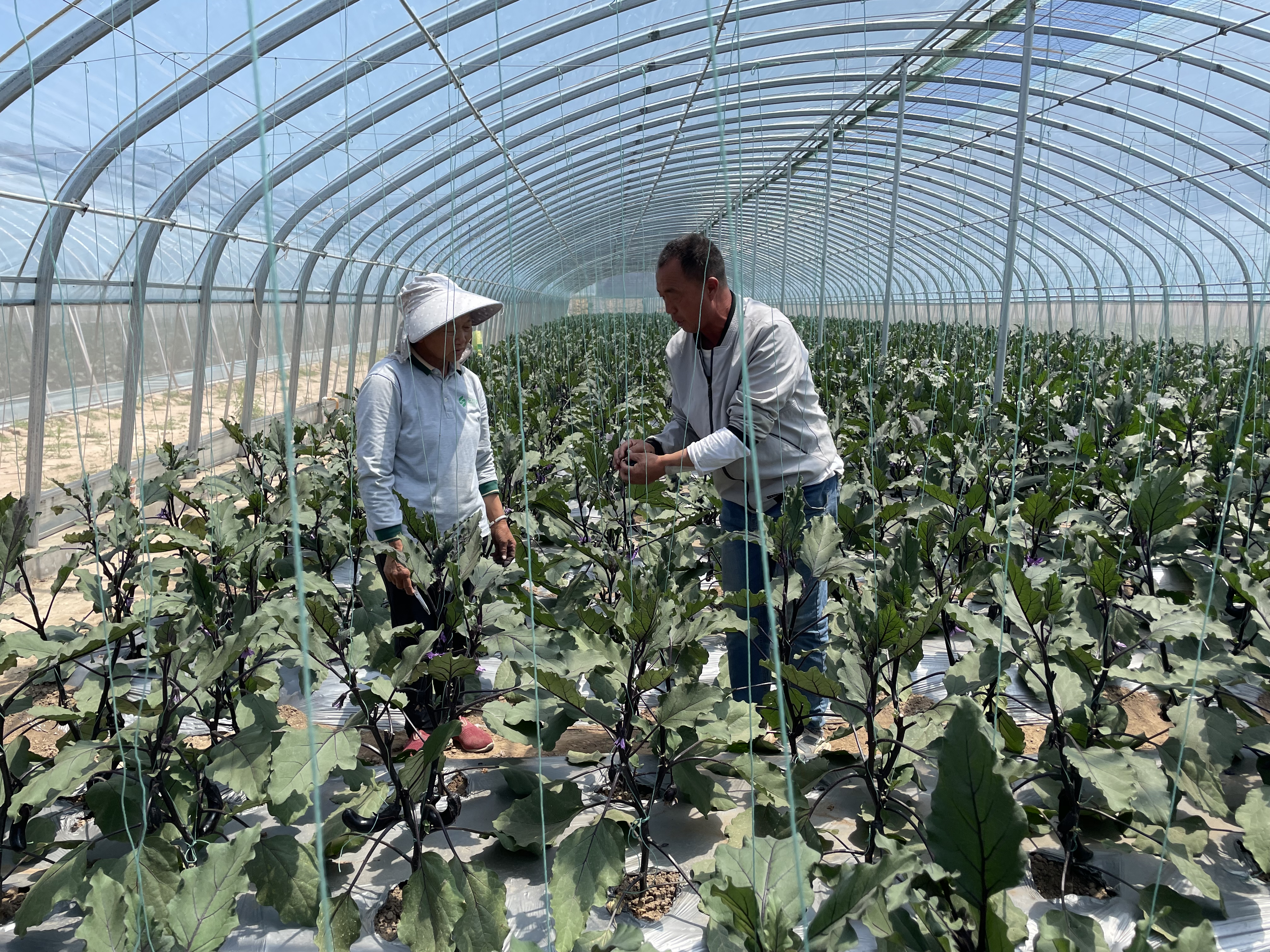 王學(xué)國(guó)(右一)正向脫貧戶(hù)康林芳傳授茄子修剪技術(shù)。新華社記者劉彤 攝