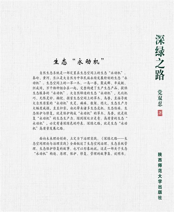 面向未來理論創(chuàng)新,立定當(dāng)下治理實(shí)踐。《深綠之路——生態(tài)空間理論與治理實(shí)踐》全面敘述了生態(tài)空間治理、生態(tài)系統(tǒng)管理、生態(tài)保護(hù)修復(fù)的故事。也可以形象地說,這是一部關(guān)于生態(tài)“永動(dòng)機(jī)”構(gòu)造、原理、保護(hù)、修復(fù)、管理的故事集、說明書。