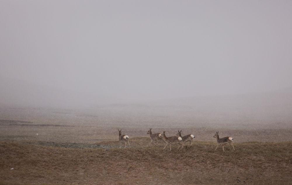 6月16日,在長江源地區(qū)的楚瑪爾河附近,幾只藏原羚在嬉戲。