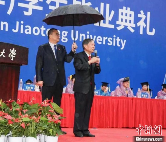 圖為西安交通大學(xué)畢業(yè)典禮當(dāng)日,該校黨委書記盧建軍為校長王樹國撐傘?!∥靼步煌ù髮W(xué)供圖