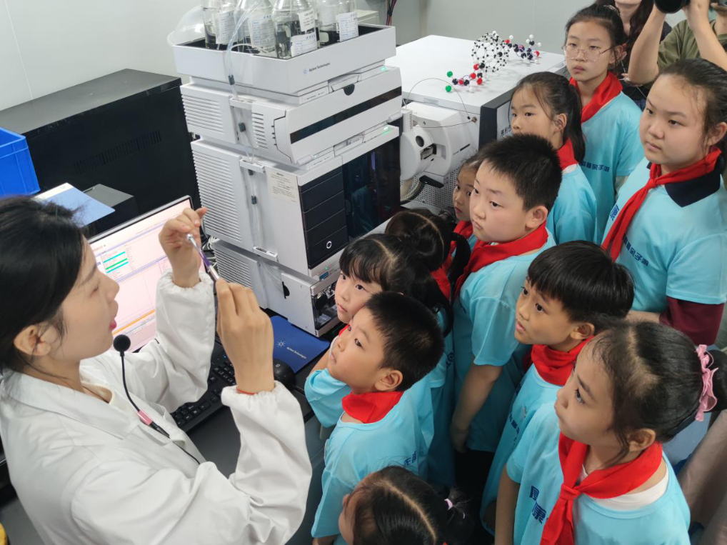 7月11日,在武漢市食品化妝品檢驗(yàn)所,工作人員向孩子們展示食品檢測過程。 (武漢市市場監(jiān)督管理局供圖)