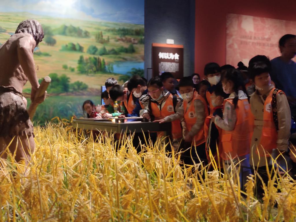 2023年3月,在新津?qū)毝者z址展廳,孩子們?cè)趨⒂^4500年前的碳化水稻。(陳煒森 攝)