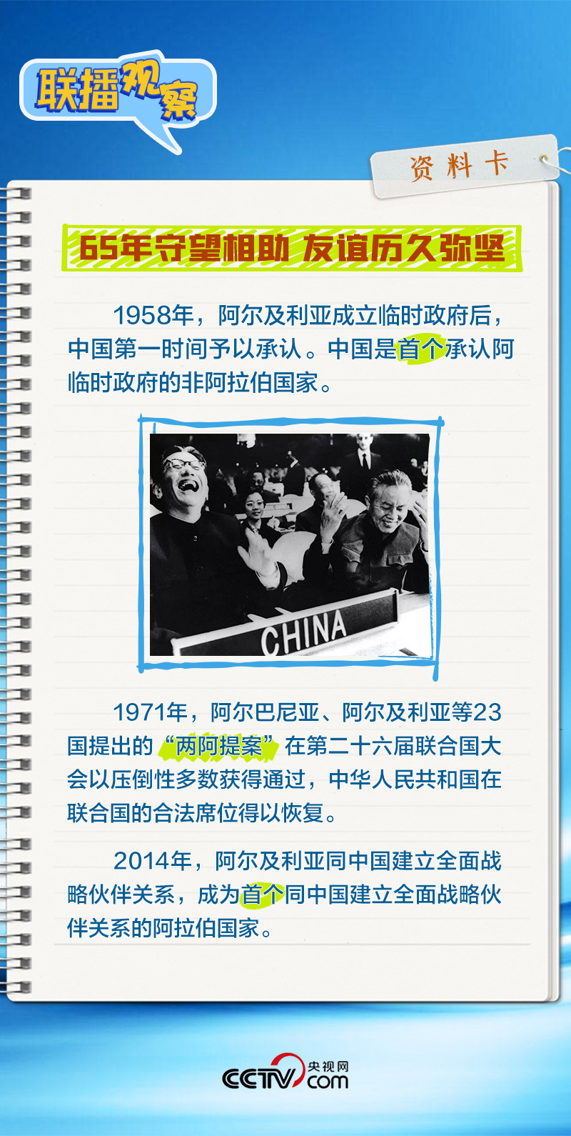 會談中,習(xí)主席特別提到,今年是中國向阿爾及利亞派遣醫(yī)療隊60周年,并稱贊此舉樹立了“中阿友誼的豐碑”。中阿傳統(tǒng)友誼深厚,兩國始終相互尊重、平等相待、彼此支持,締造了一段段友好交往的佳話。
