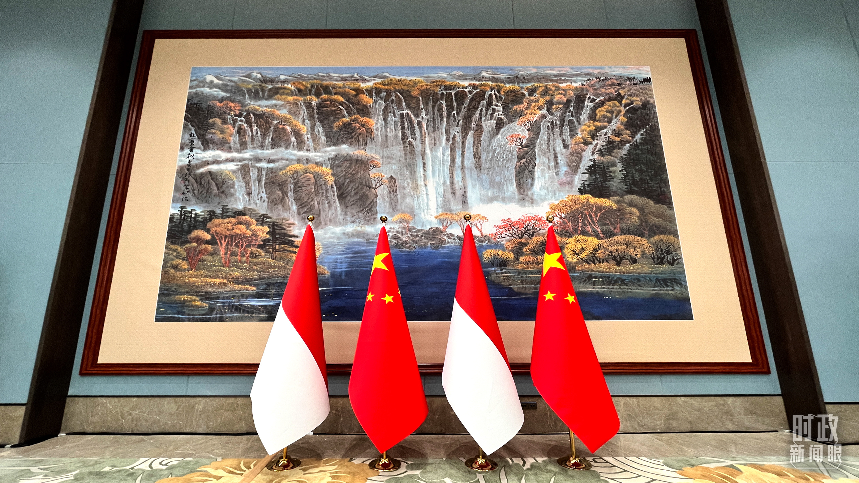 △會見現(xiàn)場的中印尼兩國國旗。(總臺央視記者張垚拍攝)