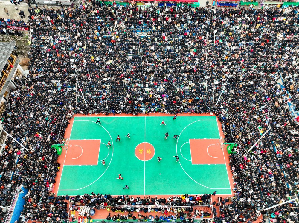 這是2023年3月27日在黔東南州臺(tái)江縣臺(tái)盤村拍攝的貴州省首屆“美麗鄉(xiāng)村”籃球聯(lián)賽總決賽比賽現(xiàn)場(chǎng)(無人機(jī)照片)。新華社記者 歐東衢 攝