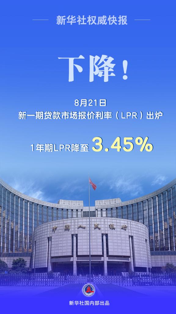 1年期LPR降至3.45%,較上一期下降10個基點