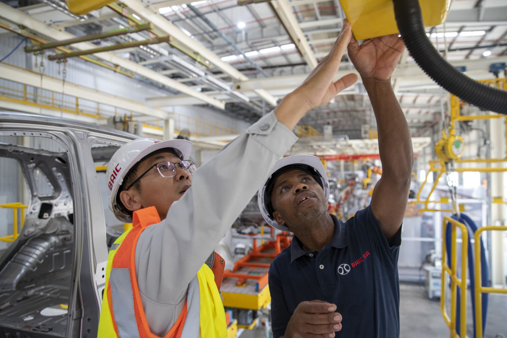 在南非東開普省北汽南非工廠,南非員工邦加尼(右)與中國(guó)同事方龍一起工作(2023年5月9日攝)。2022年,中國(guó)汽車品牌在南非的銷量突破3.5萬(wàn)臺(tái),2023年預(yù)計(jì)將突破4萬(wàn)臺(tái)。