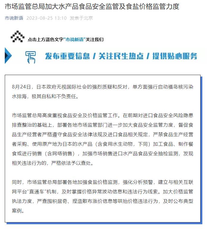 市場監(jiān)管總局高度重視食品安全及價格監(jiān)管工作。在前期對進口食品安全風(fēng)險隱患排查整治的基礎(chǔ)上,部署各地市場監(jiān)管部門進一步加大食品安全監(jiān)管力度,督促食品生產(chǎn)經(jīng)營者嚴(yán)格遵守食品安全法律法規(guī)及進口食品相關(guān)規(guī)定,嚴(yán)禁食品生產(chǎn)經(jīng)營者采購、使用原產(chǎn)地為日本的水產(chǎn)品(含食用水生動物,下同)加工食品、制作餐食或進行銷售(含網(wǎng)絡(luò)銷售),加強市場銷售進口水產(chǎn)品食品安全抽檢監(jiān)測,發(fā)現(xiàn)相關(guān)違法行為的,嚴(yán)格依法予以查處。