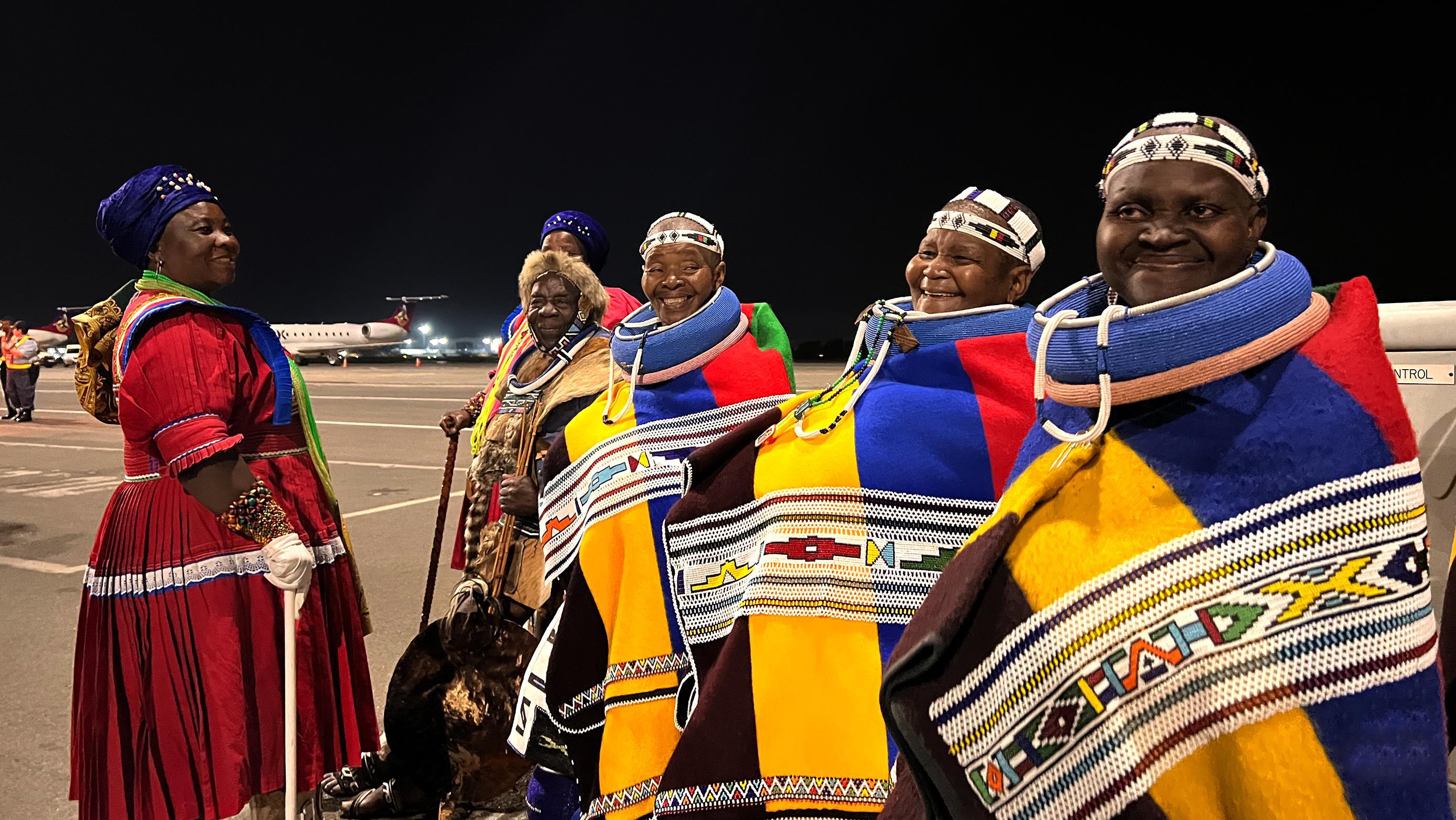△當?shù)貢r間2023年8月21日晚,習近平主席乘坐的專機抵達南非約翰內(nèi)斯堡坦博國際機場,這是身穿民族服飾迎接的當?shù)厝罕姟?/p>