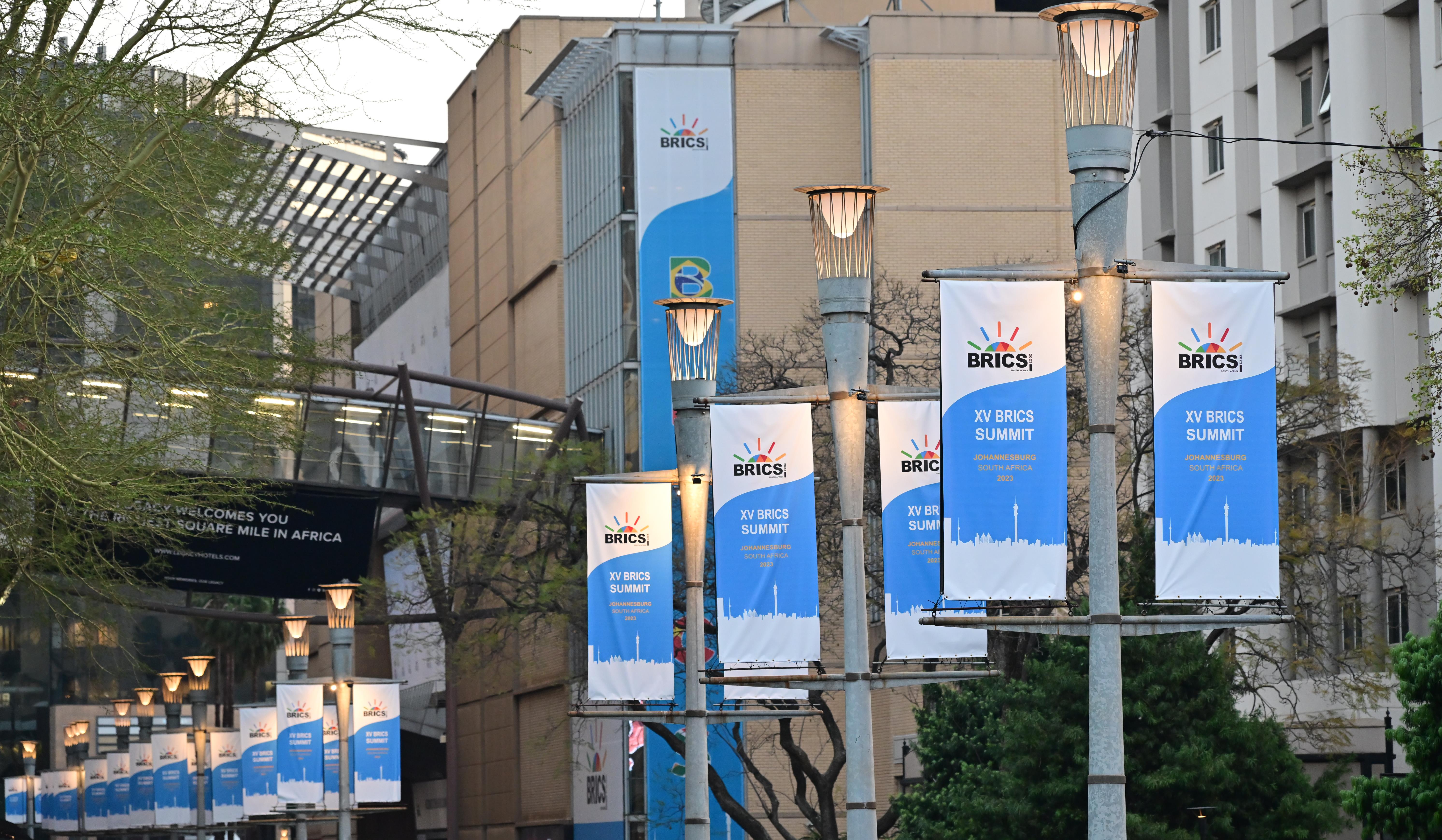 △南非約翰內(nèi)斯堡街頭懸掛的金磚峰會視覺海報
