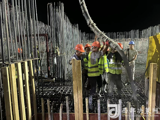 九層之臺,始于壘土。筏板作為基礎(chǔ)工程最重要的組成部分,其質(zhì)量的好壞直接影響到上部結(jié)構(gòu)的穩(wěn)固性。在完成筏板鋼筋綁扎后,2臺長臂泵車、34輛混凝土罐車開始送料。澆筑期間,映入眼簾的是一片繁忙之景,22名管理人員,110余名勞務(wù)人員正以時不我待的緊迫感,全力以赴抓緊抓實(shí)項目建設(shè),共同助力項目建設(shè)跑出加速度。