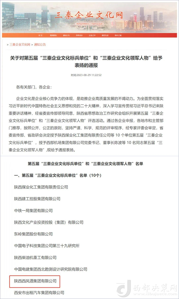 西部決策網(wǎng)訊(記者劉玉 韓宗憲 通訊員 馬迪)近日,從陜西省委宣傳部、陜西省思想政治工作研究會傳來喜訊,西鳳集團(tuán)公司以在企業(yè)文化建設(shè)方面的突出成績,從眾多評選單位中脫穎而出,獲得“三秦企業(yè)文化標(biāo)兵單位”光榮稱號。