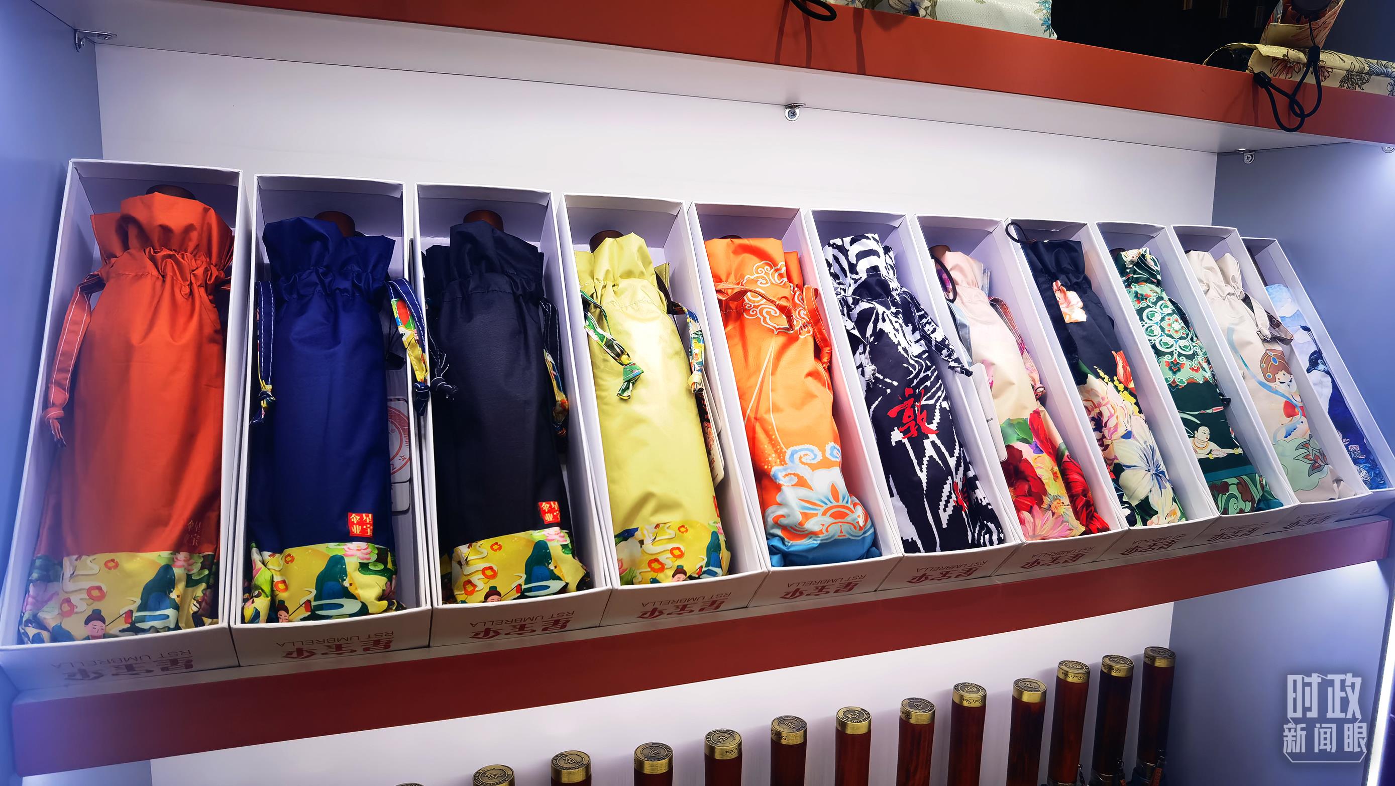 △商貿(mào)城內(nèi)的一家傘鋪,貨架上擺放著包裝精美的雨傘。(總臺央視記者范學(xué)禹拍攝)