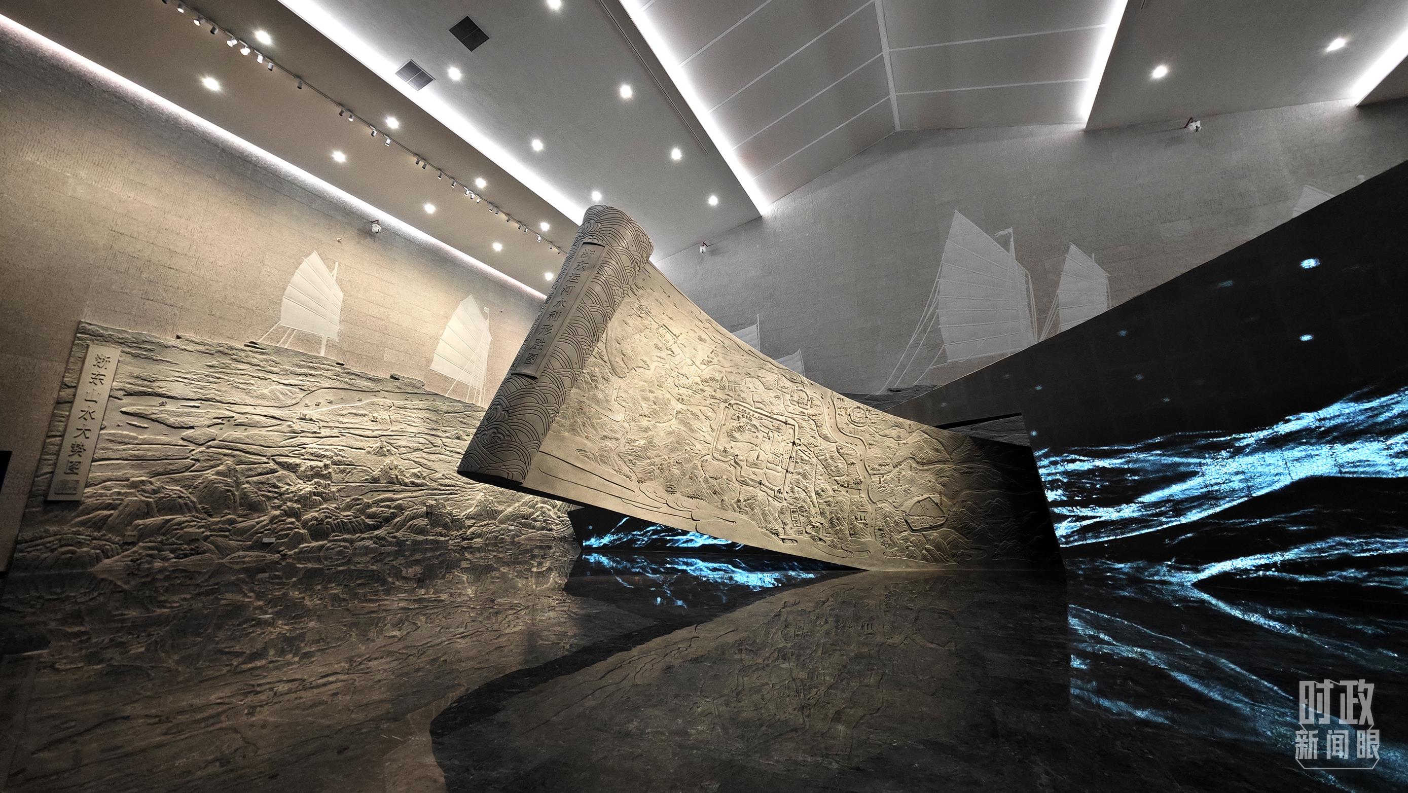 △博物館內(nèi)的《浙東運(yùn)河水利形勝圖》《浙東山水大勢圖》浮雕。(總臺央視記者彭漢明拍攝)
