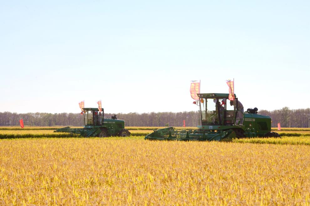 北大荒集團(tuán)普陽農(nóng)場有限公司第三管理區(qū)水稻種植綜合標(biāo)準(zhǔn)化示范區(qū)的割曬機(jī)分段收獲現(xiàn)場。(李道民 攝)