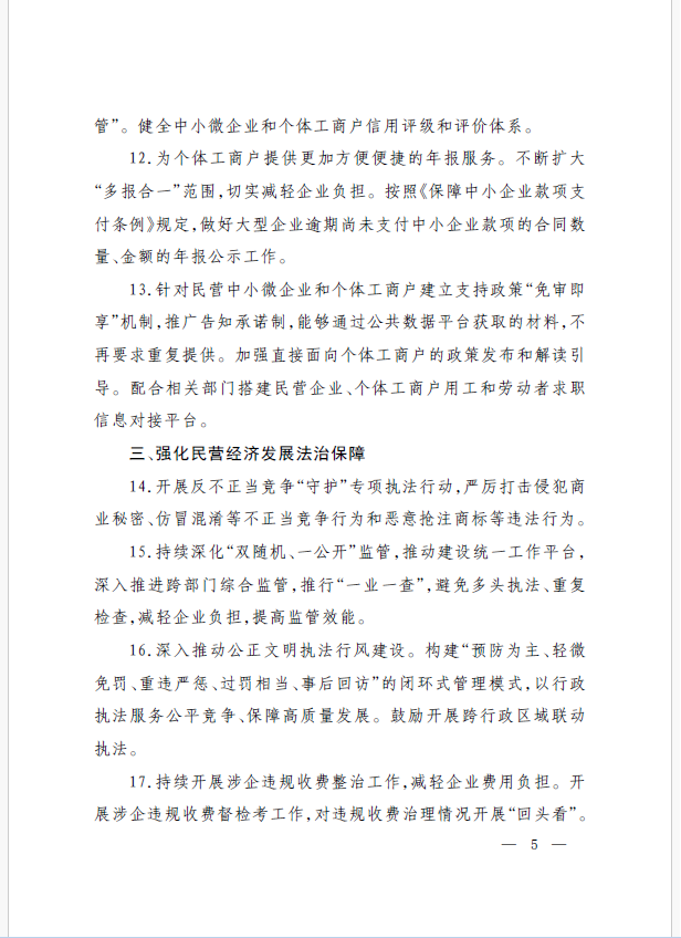 22條舉措聚焦五個方面,落實(shí)《意見》部署要求,回應(yīng)了民營經(jīng)濟(jì)各類關(guān)切:一是持續(xù)優(yōu)化民營經(jīng)濟(jì)發(fā)展環(huán)境。持續(xù)破除市場準(zhǔn)入壁壘,全面落實(shí)公平競爭政策制度,強(qiáng)化制止濫用行政權(quán)力排除、限制競爭的反壟斷執(zhí)法,完善社會信用激勵約束機(jī)制,健全失信行為糾正后的信用修復(fù)機(jī)制。二是加大對民營經(jīng)濟(jì)政策支持力度。完善信用信息歸集共享,健全中小微企業(yè)和個體工商戶信用評級和評價體系。完善支持政策直達(dá)快享機(jī)制。三是強(qiáng)化民營經(jīng)濟(jì)發(fā)展法治保障。持續(xù)完善知識產(chǎn)權(quán)保護(hù)體系,完善監(jiān)管執(zhí)法體系,杜絕選擇性執(zhí)法,健全涉企收費(fèi)長效監(jiān)管機(jī)制。四是著力推動民營經(jīng)濟(jì)實(shí)現(xiàn)高質(zhì)量發(fā)展。支持民營企業(yè)參與標(biāo)準(zhǔn)制定,計(jì)量服務(wù)中小企業(yè)。依法規(guī)范和引導(dǎo)民營資本健康發(fā)展,推動平臺經(jīng)濟(jì)健康發(fā)展。五是持續(xù)營造關(guān)心促進(jìn)民營經(jīng)濟(jì)發(fā)展壯大社會氛圍,及時推廣經(jīng)驗(yàn)做法,加大宣傳。