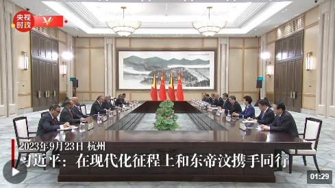 當天,從上午到晚上,習(xí)近平主席在杭州會見多位亞洲國家領(lǐng)導(dǎo)人,為國際貴賓舉行歡迎宴會,并同他們共同出席杭州亞運會開幕式。從習(xí)主席在會見和致辭時的重要講話,到別具特色的歡迎宴會、精彩紛呈的開幕式,都傳遞了豐富的信息?!稌r政新聞眼》為你解讀。