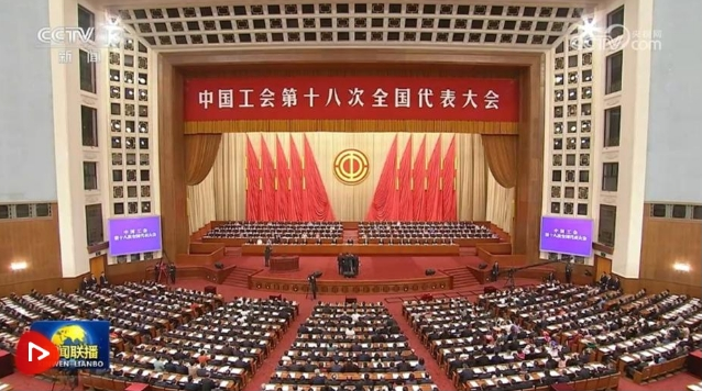 人民大會堂大禮堂氣氛熱烈。主席臺上方懸掛著“中國工會第十八次全國代表大會”的會標,后幕正中象征著中國工會和中國工人階級團結(jié)統(tǒng)一的工會會徽熠熠生輝,10面紅旗分列兩側(cè)。二樓眺臺懸掛著“堅持以習近平新時代中國特色社會主義思想為指導(dǎo),全面貫徹黨的二十大精神,組織動員億萬職工為全面建設(shè)社會主義現(xiàn)代化國家、全面推進中華民族偉大復(fù)興團結(jié)奮斗!”的巨型橫幅。