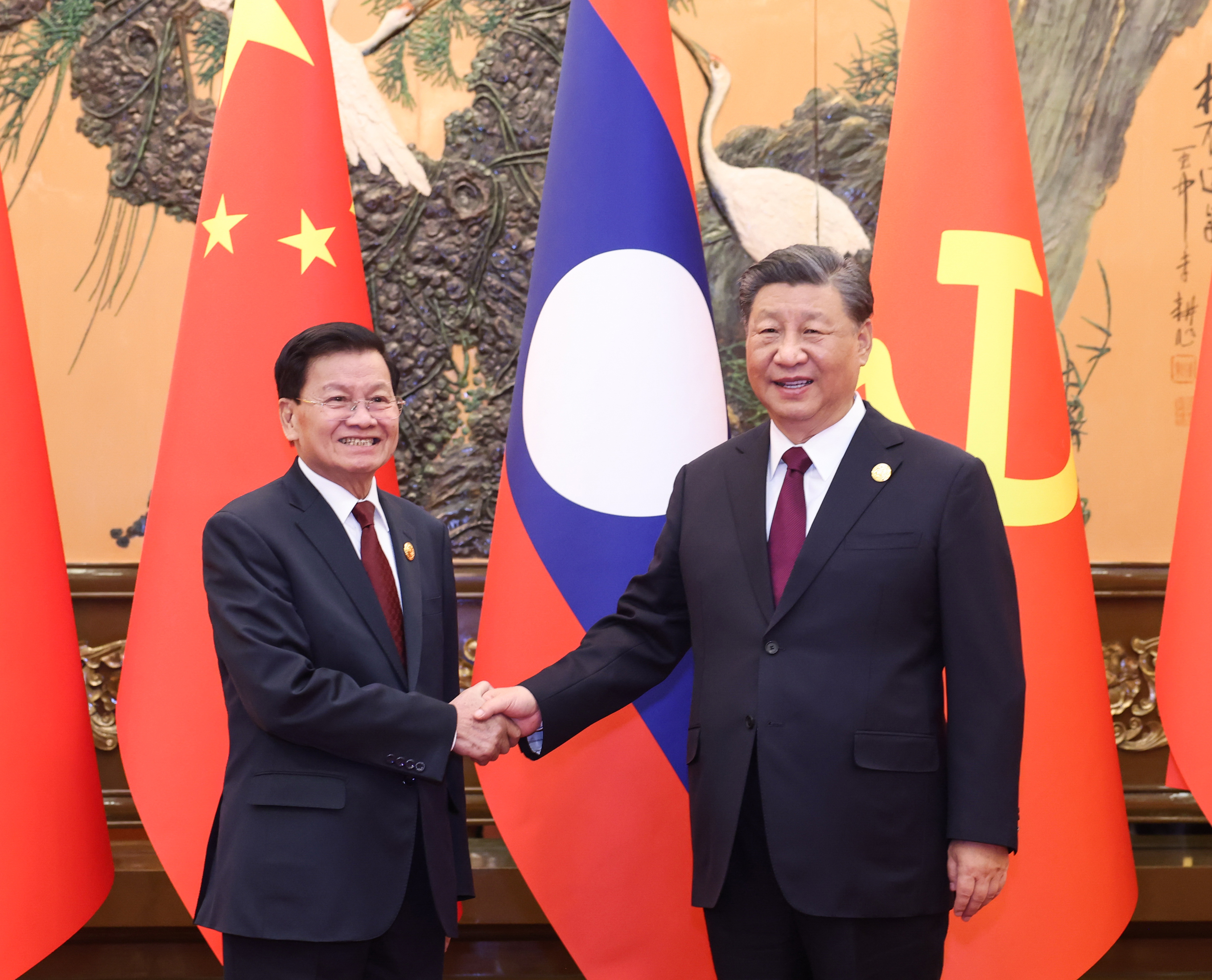 10月20日上午,中共中央總書記、國家主席習(xí)近平在人民大會堂會見來華出席第三屆“一帶一路”國際合作高峰論壇并進(jìn)行工作訪問的老撾人民革命黨中央總書記、國家主席通倫。