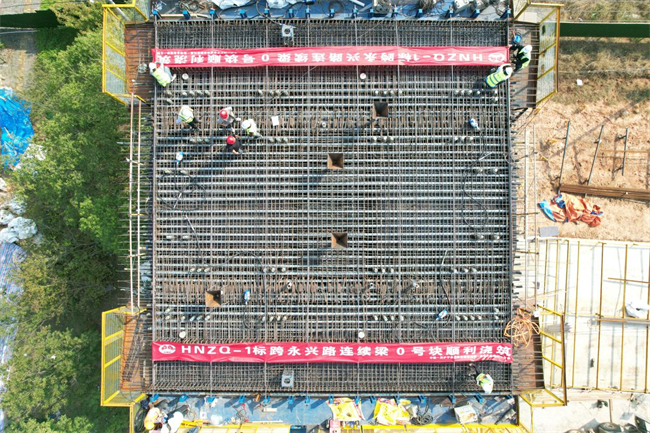 跨京滬高鐵立交特大橋位于滁河西岸,安徽省滁州市南譙區(qū)烏衣鎮(zhèn)和全椒縣十字鎮(zhèn)境內(nèi),總長17.5公里。其中跨永興路連續(xù)梁為三跨變截面箱梁,跨越滁州市南讓區(qū)永興路,橋跨位置對應(yīng)跨京滬高鐵立交特大橋180#墩至183#墩,全長177.7米,0#塊長度達12米。由于0#段內(nèi)預(yù)應(yīng)力筋布置復(fù)雜、非預(yù)應(yīng)力筋密集,要求一次澆筑成型,施工難度大。為保證施工質(zhì)量,此次澆筑總體以“統(tǒng)籌規(guī)劃、科學組織、重點先行、分段展開、均衡生產(chǎn)、標準化作業(yè)、有序推進”為原則展開施工。