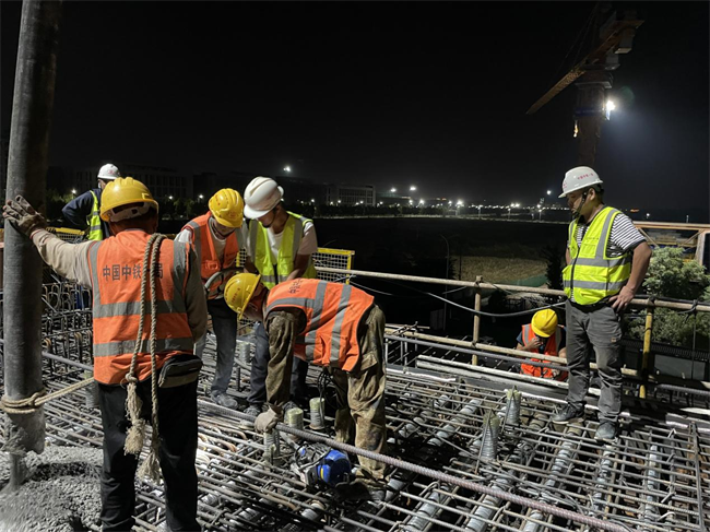 整個澆筑自10月15日下午4點44分開始,至10月16日早上7點30分結(jié)束,共用時14.77小時,本次澆筑采用泵送加下料管入模、附著式平板振動器加插入式振動器相結(jié)合的施工工藝,澆筑混凝土共計305方。此次澆筑為后續(xù)連續(xù)梁施工奠定了良好的基礎(chǔ),標志著跨京滬高鐵立交特大橋施工正式進入控制性工程。