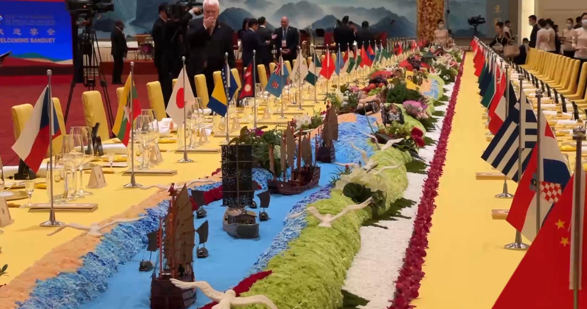 在10月17日晚舉行的歡迎宴會上,嘉賓們被這樣一個細節(jié)深深打動——晚宴餐臺以“撫古觀今、擁抱未來”為主題,南側(cè)展示著古代絲綢之路的微觀景象:海邊碼頭上擺放著對外出口的瓷器、絲綢、茶葉等貿(mào)易物資,路上擺放有從西域引進的蔬菜瓜果;餐臺北側(cè)為21世紀(jì)絲綢之路的景觀:以北京天壇的裝飾為起點,中間穿插高鐵、中歐班列、新能源汽車等擺件,展現(xiàn)各國互聯(lián)互通的景象……