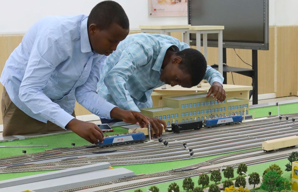 △2022年9月19日,在位于吉布提首都吉布提市的工商學(xué)校,學(xué)生在魯班工坊鐵道運營沙盤教學(xué)區(qū)學(xué)習(xí)。