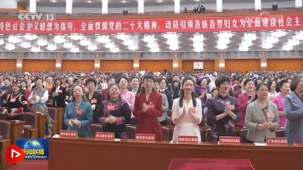 人民大會堂大禮堂氣氛莊重?zé)崃?。主席臺上方懸掛著“中國婦女第十三次全國代表大會”會標,后幕正中是鮮艷的中華全國婦女聯(lián)合會會徽,10面紅旗分列兩側(cè)。二樓眺臺懸掛著“以習(xí)近平新時代中國特色社會主義思想為指導(dǎo),全面貫徹黨的二十大精神,動員引領(lǐng)各族各界婦女為全面建設(shè)社會主義現(xiàn)代化國家、全面推進中華民族偉大復(fù)興而團結(jié)奮斗!”巨型橫幅。
