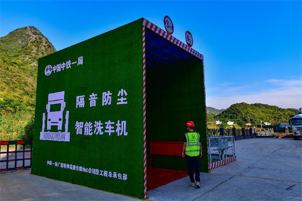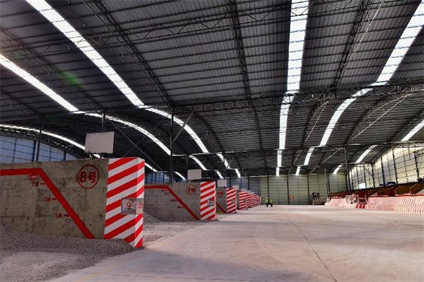 項目施工,拌和站建設必是首當其沖。5、8標拌和站建設,大門劃分出分流道,使人車各行其道;設置保安室、門禁系統(tǒng),實行嚴格管里;劃分拌和作業(yè)區(qū)、材料堆放區(qū)及運輸車輛停放區(qū),起到有序作業(yè);站區(qū)設置自動噴淋洗車池、廢水沉淀池,布設排水系統(tǒng);拌和站四周設置圍墻圍欄,安裝視頻監(jiān)控系統(tǒng),實行封閉式、可視式實時管理;水泥拌和樓主體全封包,上料倉加蓋雨棚,除上料這面外,其它三面圍閉,且料倉間擋板延伸至雨棚頂,徹底隔斷串料隱患。料倉配備自動識別噴霧除塵設備,有效防止粉塵擴散,降低空氣污染;配備粗集料水洗設備,洗去微量的石粉和雜質(zhì),提高砂石的質(zhì)量。在此基礎上,兩家項目部各有創(chuàng)新亮點。