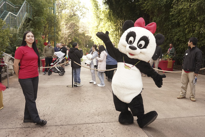 2月4日,在美國圣迭戈動物園,一名裝扮成熊貓的工作人員在春節(jié)慶祝活動上歡迎游客。