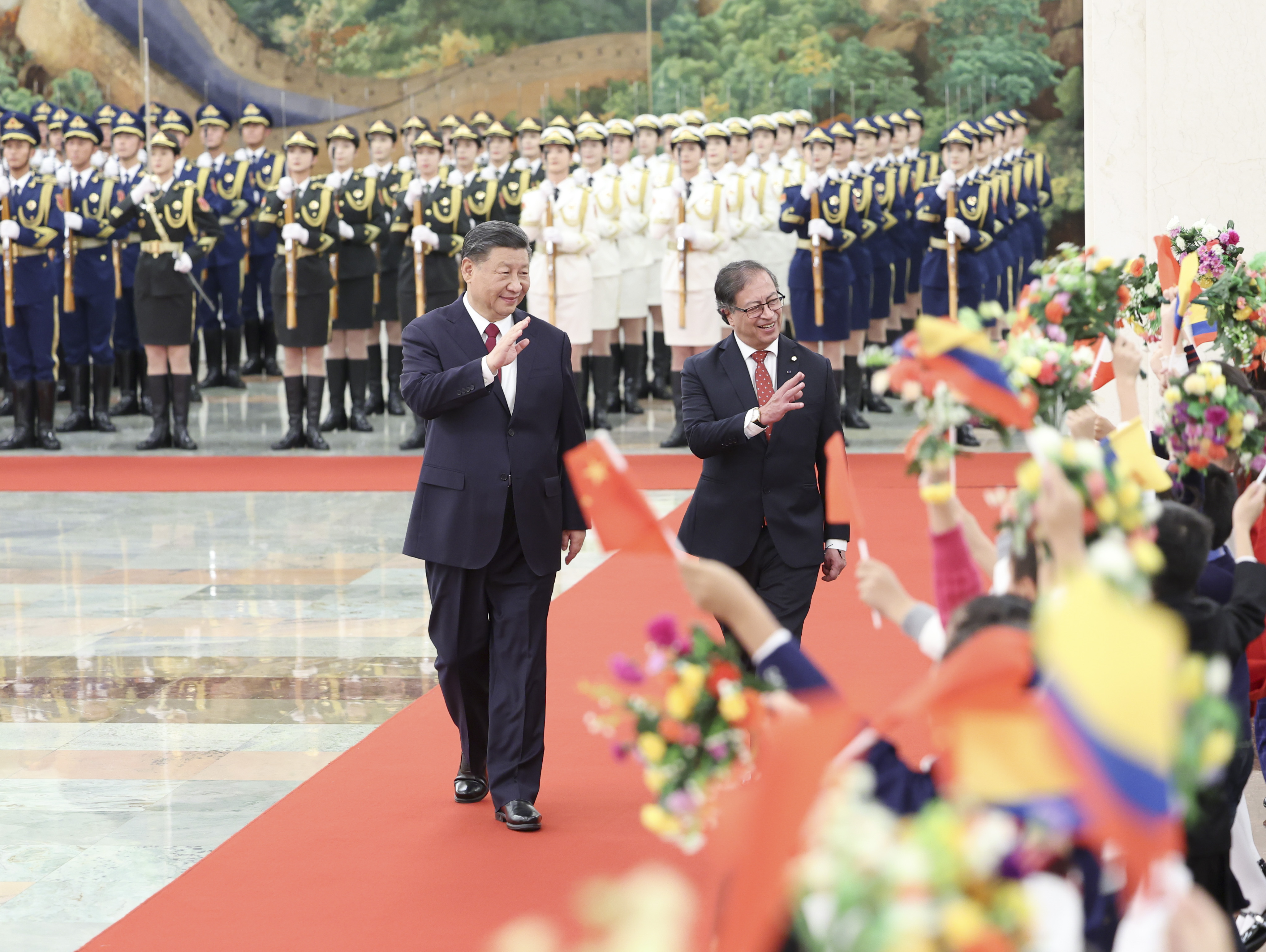 10月25日下午,國家主席習(xí)近平在北京人民大會(huì)堂同來華進(jìn)行國事訪問的哥倫比亞總統(tǒng)佩特羅舉行會(huì)談。這是會(huì)談前,習(xí)近平在人民大會(huì)堂北大廳為佩特羅舉行歡迎儀式。