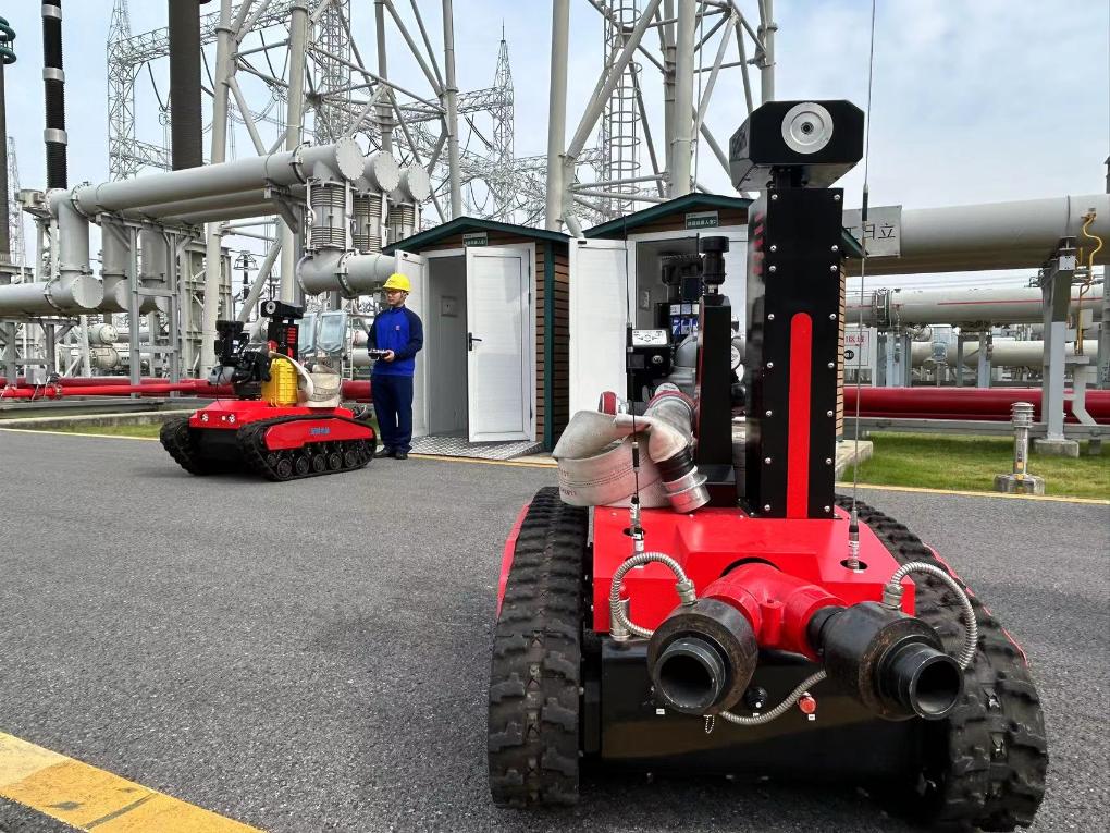 古泉換流站內(nèi),消防員正在調(diào)試消防滅火偵察機器人。新華社記者吳慧珺 攝