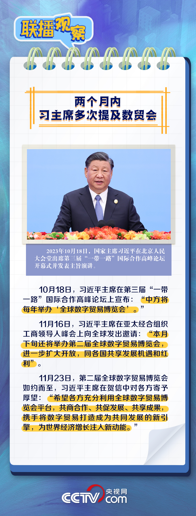 聯(lián)播+“當(dāng)前,全球數(shù)字貿(mào)易蓬勃發(fā)展,成為國(guó)際貿(mào)易的新亮點(diǎn)。”11月23日,習(xí)近平主席向第二屆全球數(shù)字貿(mào)易博覽會(huì)致賀信,回顧了近年來(lái)中國(guó)為全球數(shù)字貿(mào)易蓬勃發(fā)展付出的努力,并對(duì)與會(huì)各方寄予厚望。
