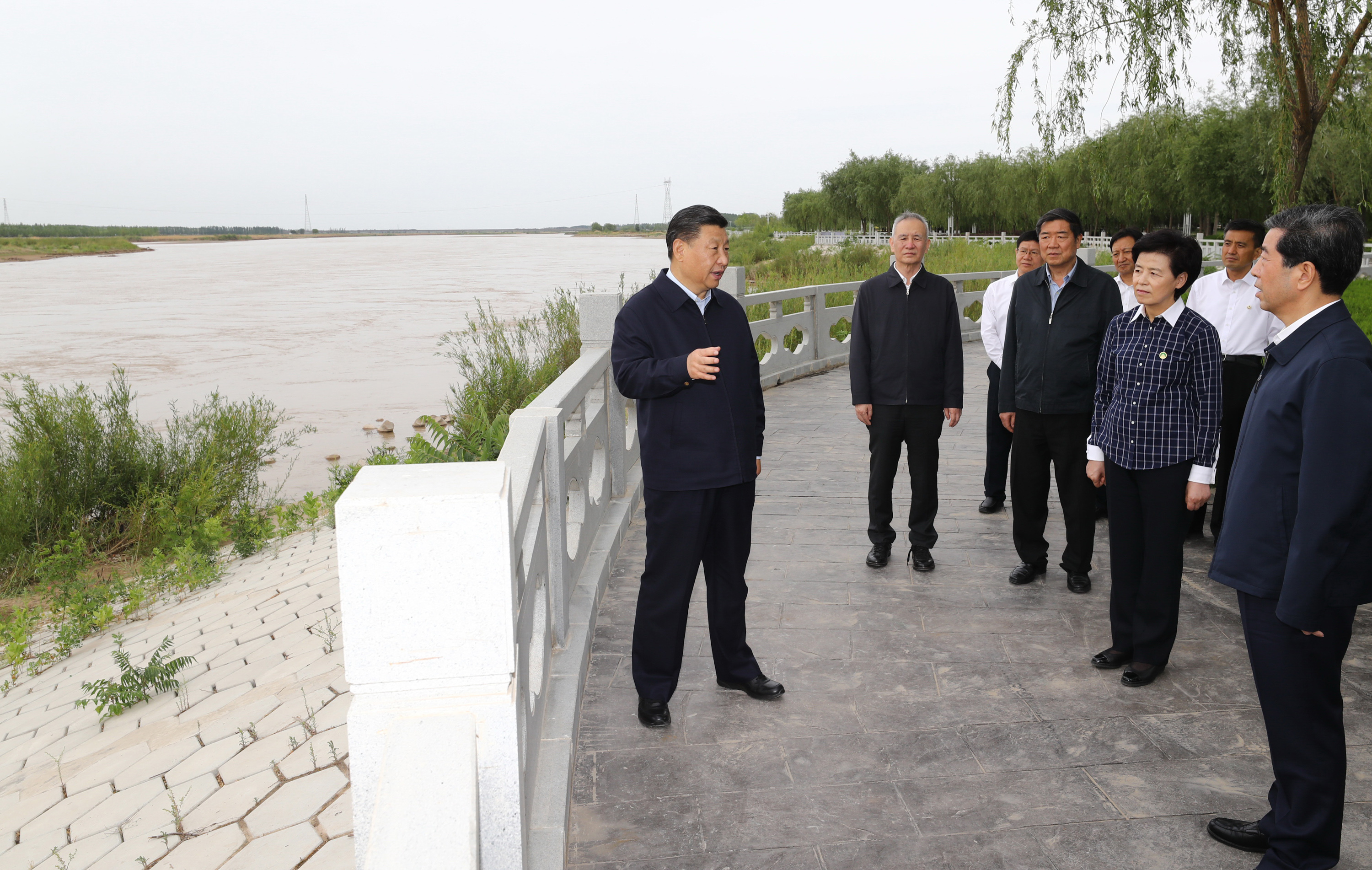 2020年6月8日,習(xí)近平在寧夏黃河吳忠濱河大道古城灣砌護段,察看黃河生態(tài)治理保護狀況。