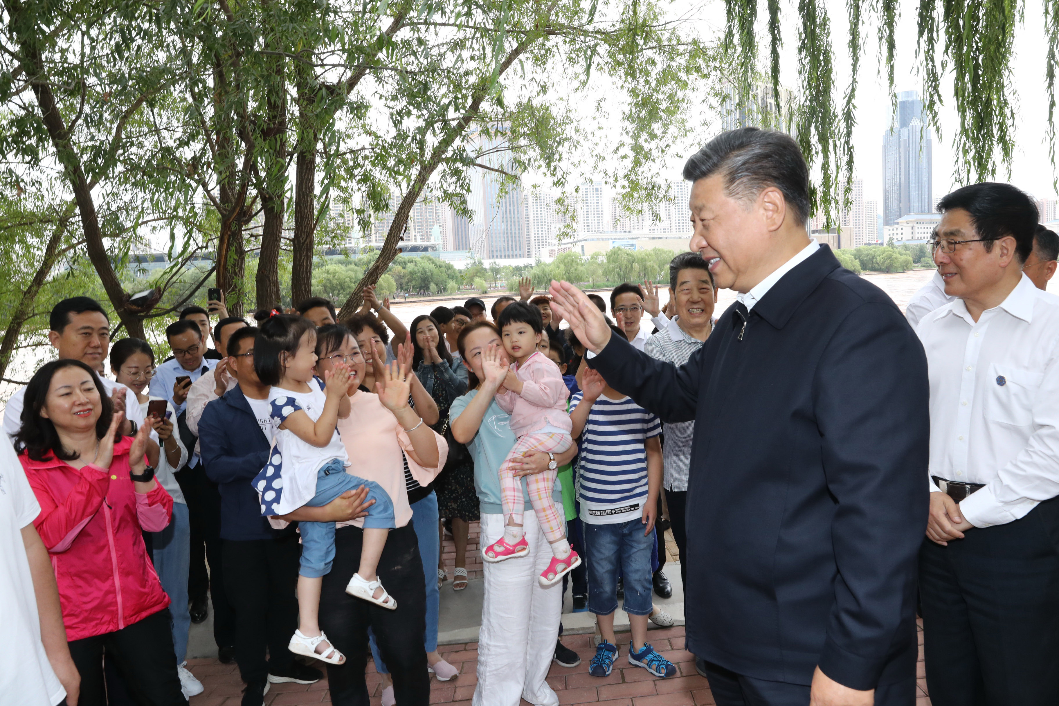 2019年8月21日,習(xí)近平在蘭州市黃河治理蘭鐵泵站項目點同正在休閑的群眾親切交談。