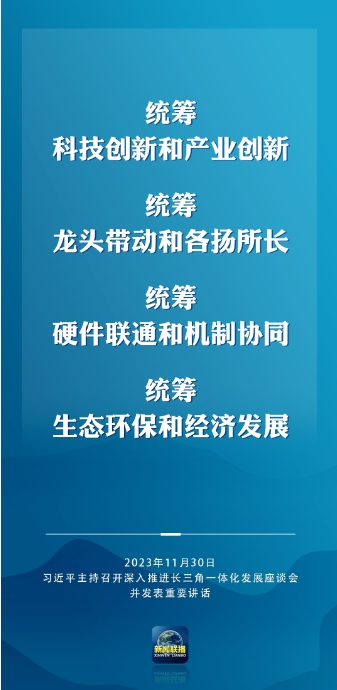 習(xí)近平強(qiáng)調(diào),要完整、準(zhǔn)確、全面貫徹新發(fā)展理念,緊扣一體化和高質(zhì)量這兩個(gè)關(guān)鍵詞,樹立全球視野和戰(zhàn)略思維,堅(jiān)定不移深化改革、擴(kuò)大高水平開放,統(tǒng)籌科技創(chuàng)新和產(chǎn)業(yè)創(chuàng)新,統(tǒng)籌龍頭帶動(dòng)和各揚(yáng)所長,統(tǒng)籌硬件聯(lián)通和機(jī)制協(xié)同,統(tǒng)籌生態(tài)環(huán)保和經(jīng)濟(jì)發(fā)展,在推進(jìn)共同富裕上先行示范,在建設(shè)中華民族現(xiàn)代文明上積極探索,推動(dòng)長三角一體化發(fā)展取得新的重大突破,在中國式現(xiàn)代化中走在前列,更好發(fā)揮先行探路、引領(lǐng)示范、輻射帶動(dòng)作用。