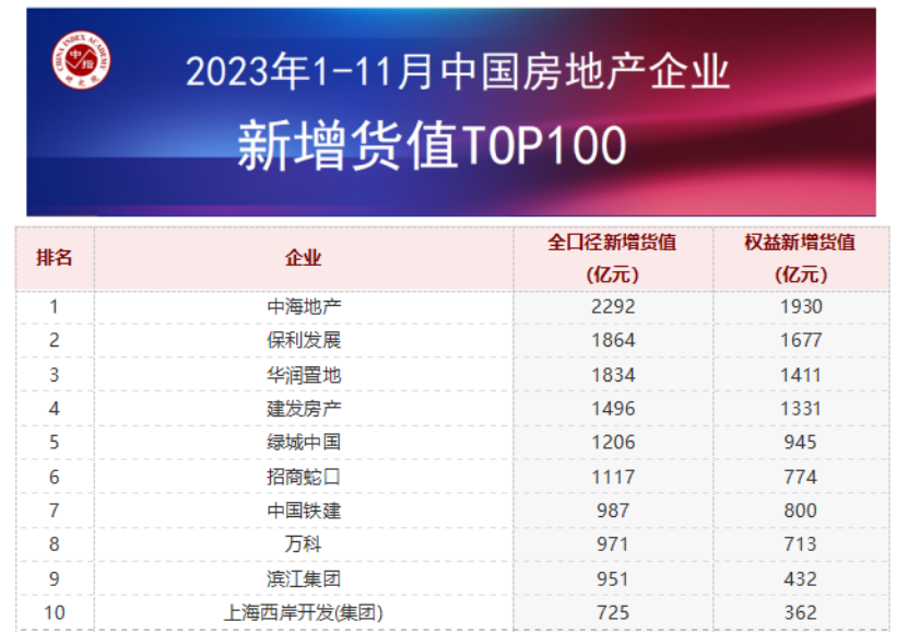 根據(jù)中指研究院數(shù)據(jù)顯示,中海地產(chǎn)、保利發(fā)展、華潤置地占據(jù)新增貨值榜單前三位。2023年1-11月,中海地產(chǎn)以累計新增貨值2292億元占據(jù)榜單第一;保利發(fā)展、華潤置地緊隨其后,累計新增貨值規(guī)模分別為1864億元和1834億元。TOP10企業(yè)2023年1-11月新增貨值總額13442億元,占TOP100企業(yè)的41.7%;TOP100企業(yè)新增貨值門檻為121億元。